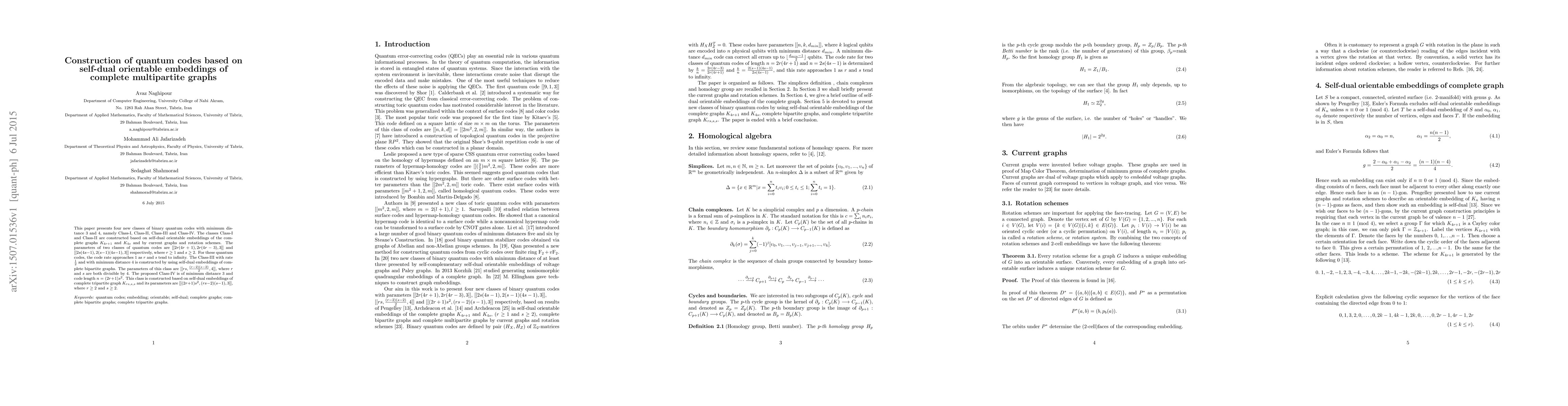 This paper introduces four new classes of binary quantum codes with minimum distances 3 and 4, constructed from self-dual orientable embeddings of complete multipartite graphs.