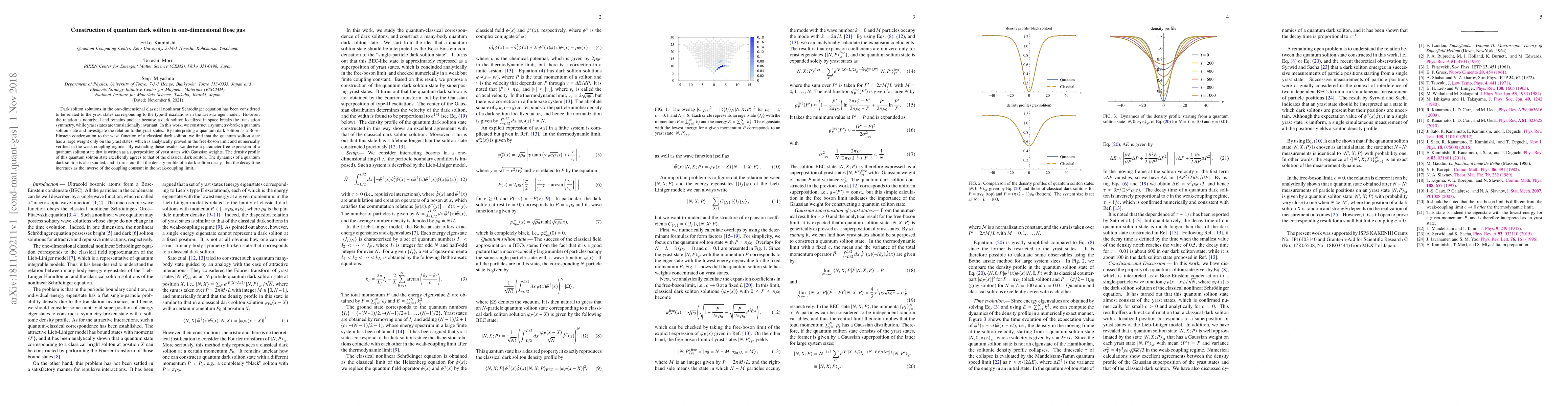 Dark soliton solutions in the one-dimensional classical nonlinear Schr\"odinger equation has been considered to be related to the yrast states corresponding to the type-II excitations in the Lieb-Liniger model. However, the relation is nontrivial and remains unclear because a dark soliton localized in space breaks the translation symmetry, while yrast states are translationally invariant. In this work, we construct a symmetry-broken quantum soliton state and investigate the relation to the yrast states. By interpreting a quantum dark soliton as a Bose-Einstein condensation to the wave function of a classical dark soliton, we find that the quantum soliton state has a large weight only on the yrast states, which is analytically proved in the free-boson limit and numerically verified in the weak-coupling regime. By extending these results, we derive a parameter-free expression of a quantum soliton state that is written as a superposition of yrast states with Gaussian weights. The density profile of this quantum soliton state excellently agrees to that of the classical dark soliton. The dynamics of a quantum dark soliton is also studied, and it turns out that the density profile of a dark soliton decays, but the decay time increases as the inverse of the coupling constant in the weak-coupling limit.
