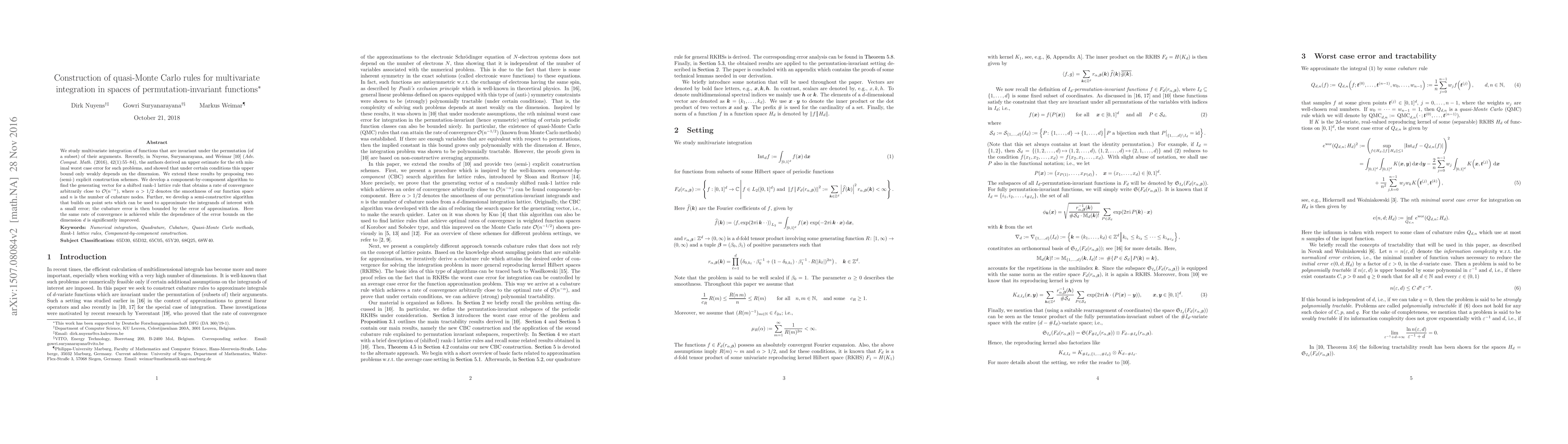 This paper proposes two construction schemes for quasi-Monte Carlo rules to integrate multivariate functions invariant under permutations of their arguments. It achieves convergence rates close to $\mathcal{O}(n^{-\alpha})$ with $\alpha > 1/2$ and improves the dimension dependence of error bounds compared to previous results.
