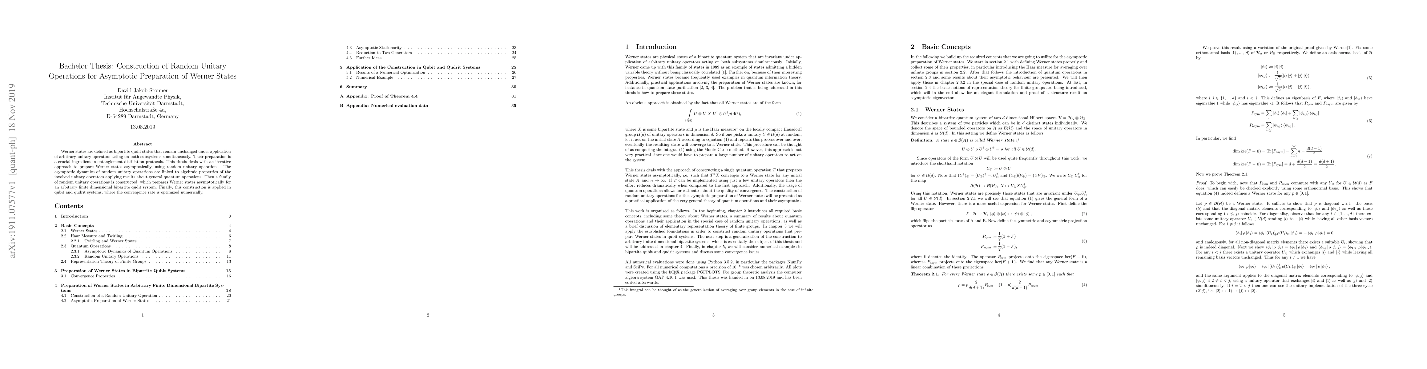 Werner states are defined as bipartite qudit states that remain unchanged under application of arbitrary unitary operators acting on both subsystems simultaneously. Their preparation is a crucial ingredient in entanglement distillation protocols. This thesis deals with an iterative approach to prepare Werner states asymptotically, using random unitary operations. The asymptotic dynamics of random unitary operations are linked to algebraic properties of the involved unitary operators applying results about general quantum operations. Then a family of random unitary operations is constructed, which prepares Werner states asymptotically for an arbitrary finite dimensional bipartite qudit system. Finally, this construction is applied in qubit and qudrit systems, where the convergence rate is optimized numerically.