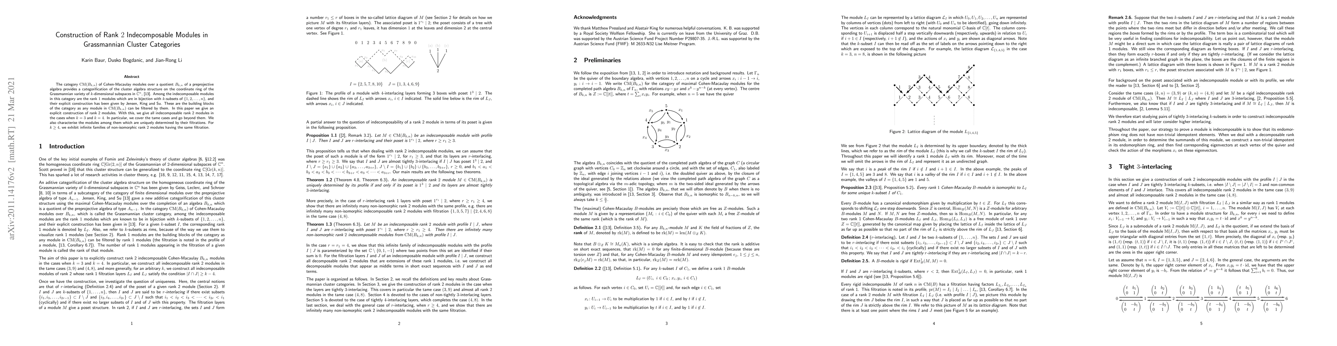 The category ${\rm CM}(B_{k,n}) $ of Cohen-Macaulay modules over a quotient $B_{k,n}$ of a preprojective algebra provides a categorification of the cluster algebra structure on the coordinate ring of the Grassmannian variety of $k$-dimensional subspaces in $\mathbb C^n$, \cite{JKS16}. Among the indecomposable modules in this category are the rank $1$ modules which are in bijection with $k$-subsets of $\{1,2,\dots,n\}$, and their explicit construction has been given by Jensen, King and Su. These are the building blocks of the category as any module in ${\rm CM}(B_{k,n}) $ can be filtered by them. In this paper we give an explicit construction of rank 2 modules. With this, we give all indecomposable rank 2 modules in the cases when $k=3$ and $k=4$. In particular, we cover the tame cases and go beyond them. We also characterise the modules among them which are uniquely determined by their filtrations. For $k\ge 4$, we exhibit infinite families of non-isomorphic rank 2 modules having the same filtration.