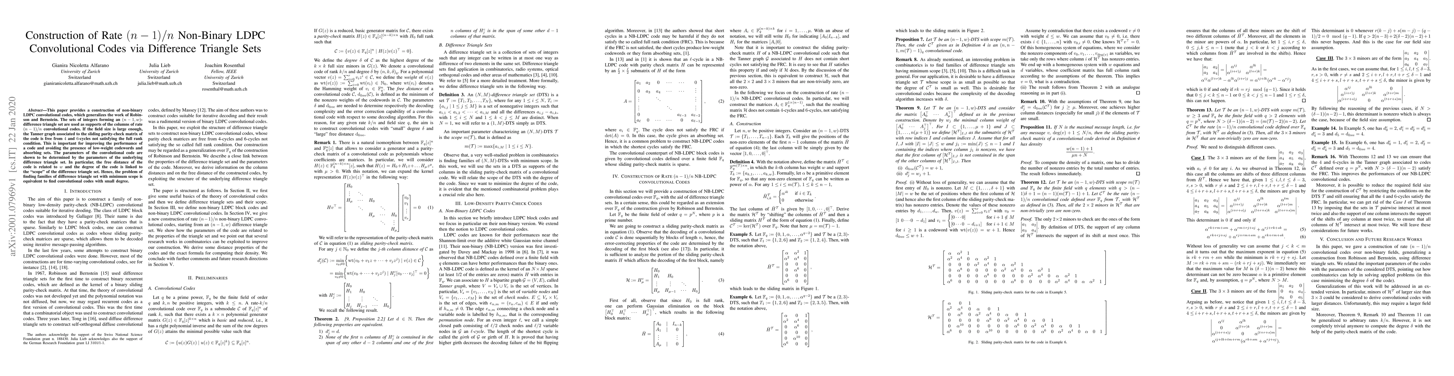 This paper constructs rate $(n-1)/n$ non-binary LDPC convolutional codes using $(n-1,w)$-difference triangle sets, improving code performance by avoiding low-weight codewords and absorbing sets. The parameters of the convolutional code are linked to the underlying difference triangle set's parameters.