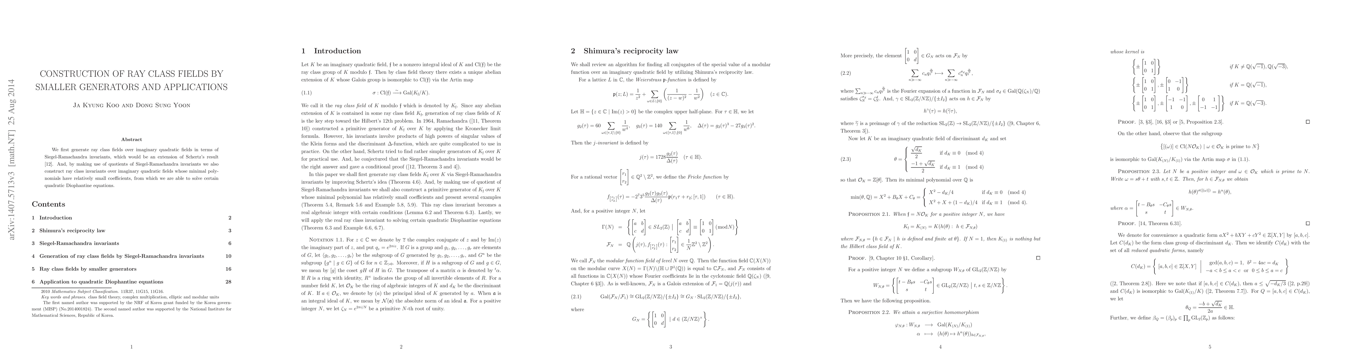 This paper constructs ray class fields over imaginary quadratic fields using Siegel-Ramachandra invariants, extending Schertz's results. It also generates ray class invariants with minimal polynomials of small coefficients, enabling solutions to specific quadratic Diophantine equations.