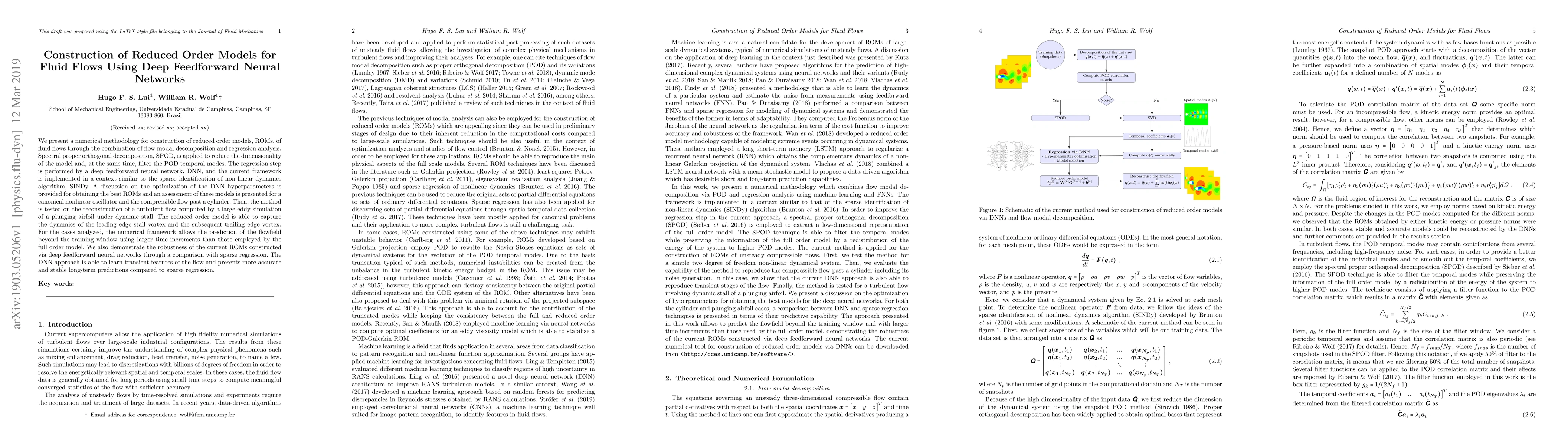 We present a numerical methodology for construction of reduced order models, ROMs, of fluid flows through the combination of flow modal decomposition and regression analysis. Spectral proper orthogonal decomposition, SPOD, is applied to reduce the dimensionality of the model and, at the same time, filter the POD temporal modes. The regression step is performed by a deep feedforward neural network, DNN, and the current framework is implemented in a context similar to the sparse identification of non-linear dynamics algorithm, SINDy. A discussion on the optimization of the DNN hyperparameters is provided for obtaining the best ROMs and an assessment of these models is presented for a canonical nonlinear oscillator and the compressible flow past a cylinder. Then, the method is tested on the reconstruction of a turbulent flow computed by a large eddy simulation of a plunging airfoil under dynamic stall. The reduced order model is able to capture the dynamics of the leading edge stall vortex and the subsequent trailing edge vortex. For the cases analyzed, the numerical framework allows the prediction of the flowfield beyond the training window using larger time increments than those employed by the full order model. We also demonstrate the robustness of the current ROMs constructed via deep feedforward neural networks through a comparison with sparse regression. The DNN approach is able to learn transient features of the flow and presents more accurate and stable long-term predictions compared to sparse regression.