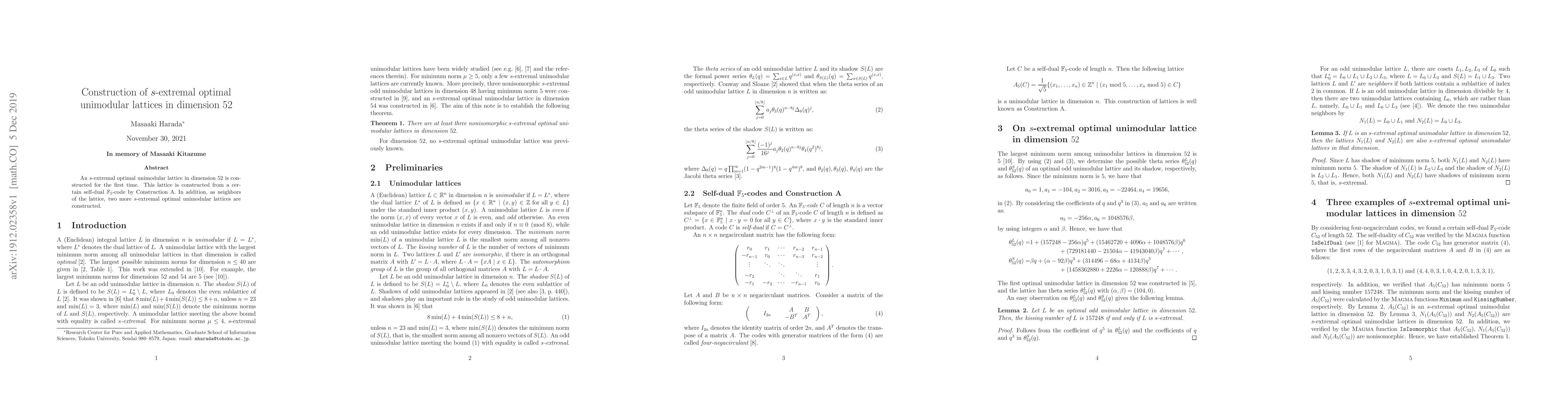 This paper constructs the first $s$-extremal optimal unimodular lattice in dimension 52, derived from a self-dual $\mathbb{F}_5$-code using Construction A. Additionally, two more $s$-extremal optimal unimodular lattices are constructed as neighbors of the main lattice.