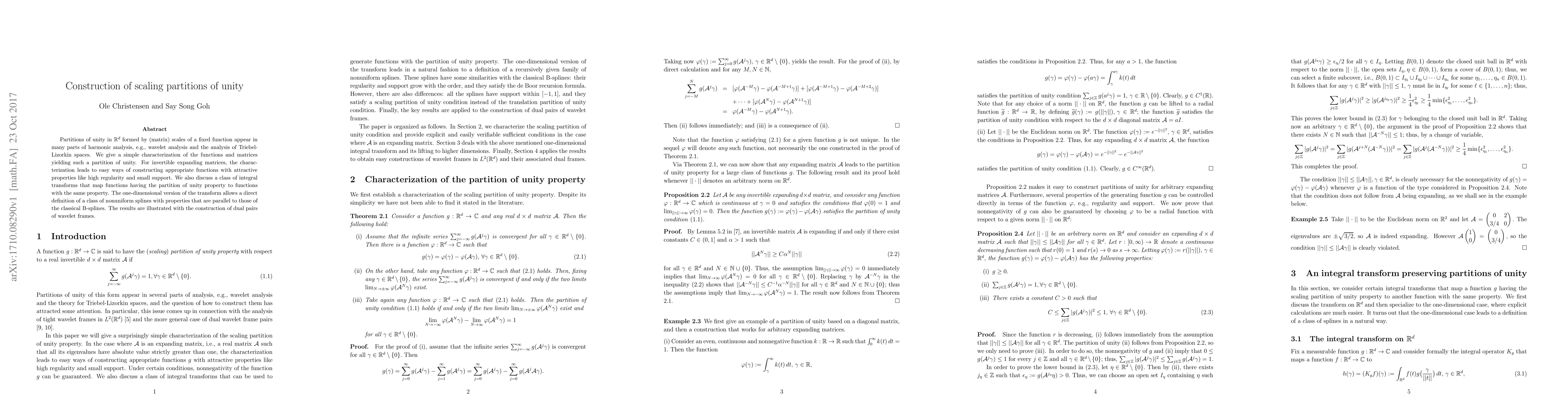 This paper characterizes functions and matrices that construct scaling partitions of unity in ${\mathbf R}^d$, useful in harmonic analysis. It provides methods for creating functions with high regularity and small support for invertible expanding matrices, and introduces a class of integral transforms that preserve the partition of unity property, including the construction of nonuniform splines akin to B-splines.