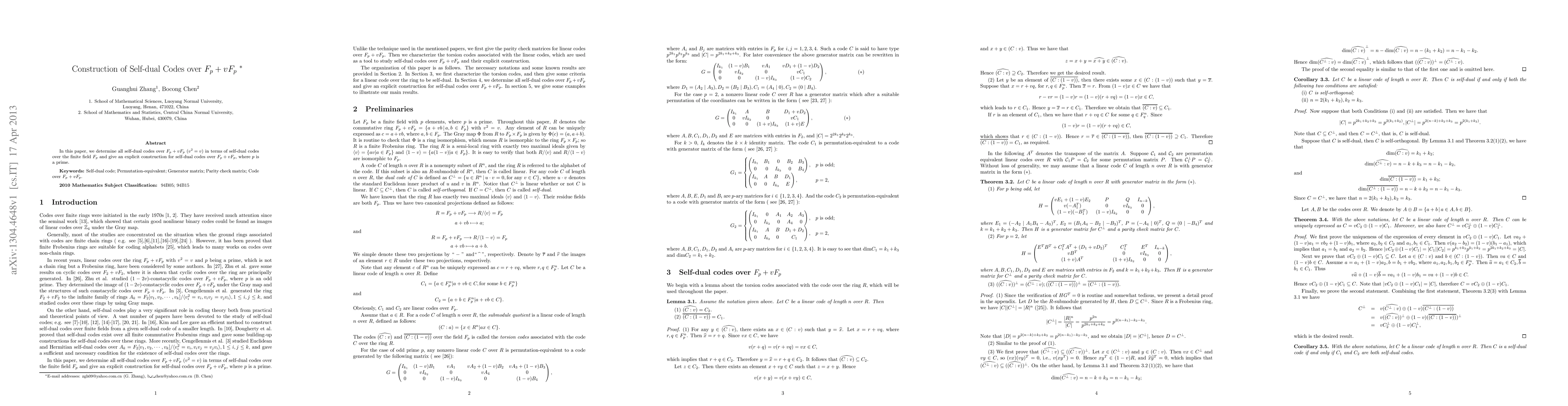 This paper identifies all self-dual codes over the ring $F_p+vF_p$ in relation to self-dual codes over $F_p$ and provides an explicit construction method for these codes. The focus is on prime $p$ where $v^2=v$.