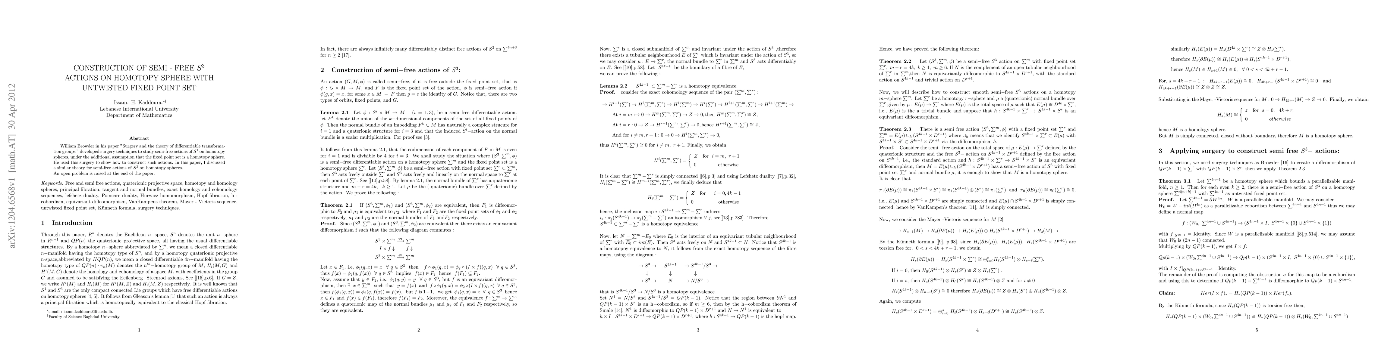 This paper extends William Browder's surgery techniques to construct semi-free actions of S3 on homotopy spheres, assuming an untwisted fixed point set that is also a homotopy sphere, and concludes with an open problem.