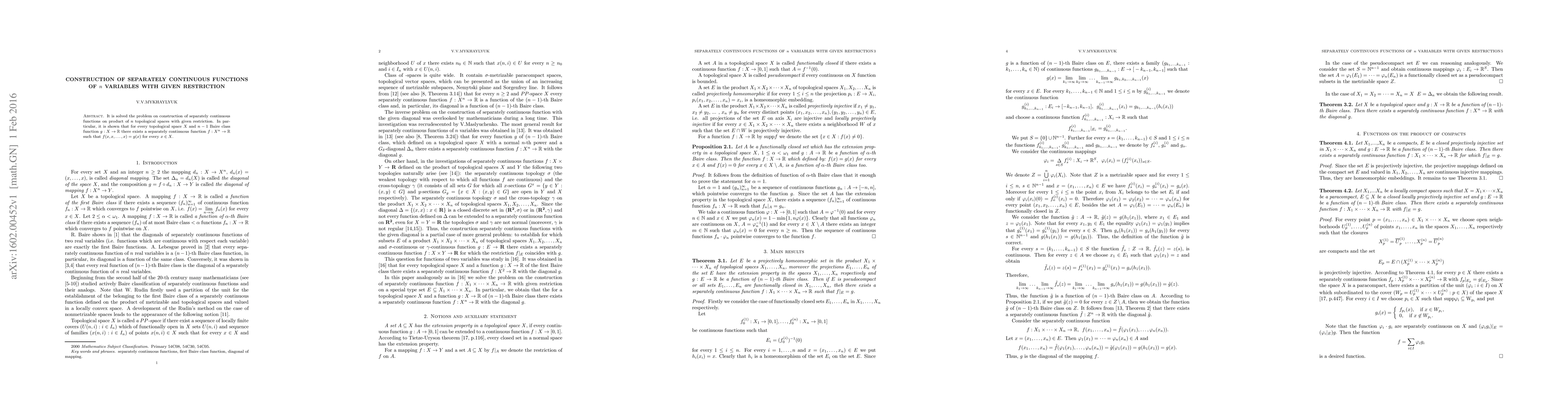 It is solved the problem on construction of separately continuous functions on product of $n$ topological spaces with given restriction. In particular, it is shown that for every topological space $X$ and $n-1$ Baire class function $g:X\to \mathbb R$ there exists a separately continuous function $f:X^n\to\mathbb R$ such that $f(x,x,\dots,x)=g(x)$ for every $x\in X$.