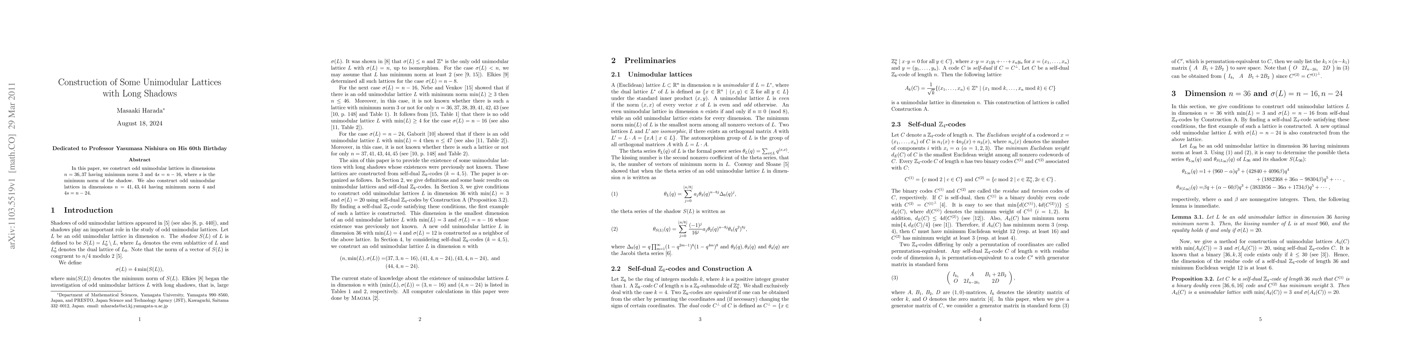This paper constructs odd unimodular lattices in dimensions 36, 37, 41, 43, and 44 with specific minimum norms and shadow lengths, including lattices with minimum norm 3 and shadow 4s=n-16 for dimensions 36 and 37, and minimum norm 4 with shadow 4s=n-24 for dimensions 41, 43, and 44.