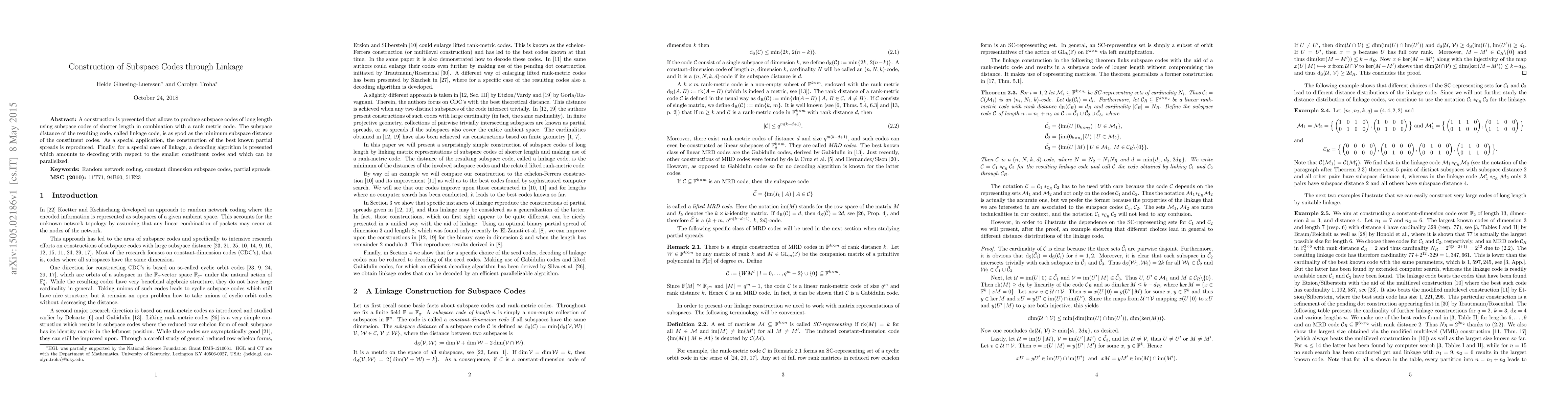 A construction is presented that allows to produce subspace codes of long length using subspace codes of shorter length in combination with a rank metric code. The subspace distance of the resulting code, called linkage code, is as good as the minimum subspace distance of the constituent codes. As a special application, the construction of the best known partial spreads is reproduced. Finally, for a special case of linkage, a decoding algorithm is presented which amounts to decoding with respect to the smaller constituent codes and which can be parallelized.