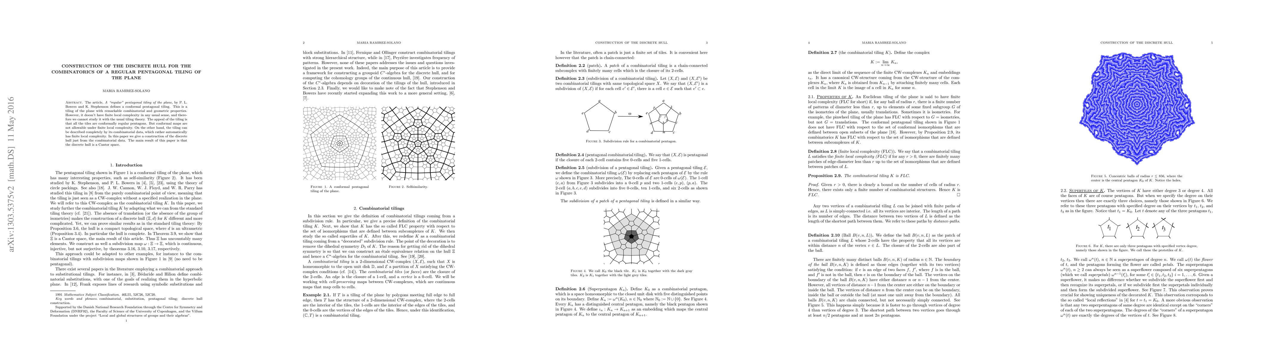 The article 'A "regular" pentagonal tiling of the plane' by P. L. Bowers and K. Stephenson defines a conformal pentagonal tiling. This is a tiling of the plane with remarkable combinatorial and geometric properties. However, it doesn't have finite local complexity in any usual sense, and therefore we cannot study it with the usual tiling theory. The appeal of the tiling is that all the tiles are conformally regular pentagons. But conformal maps are not allowable under finite local complexity. On the other hand, the tiling can be described completely by its combinatorial data, which rather automatically has finite local complexity. In this paper we give a construction of the discrete hull just from the combinatorial data. The main result of this paper is that the discrete hull is a Cantor space.