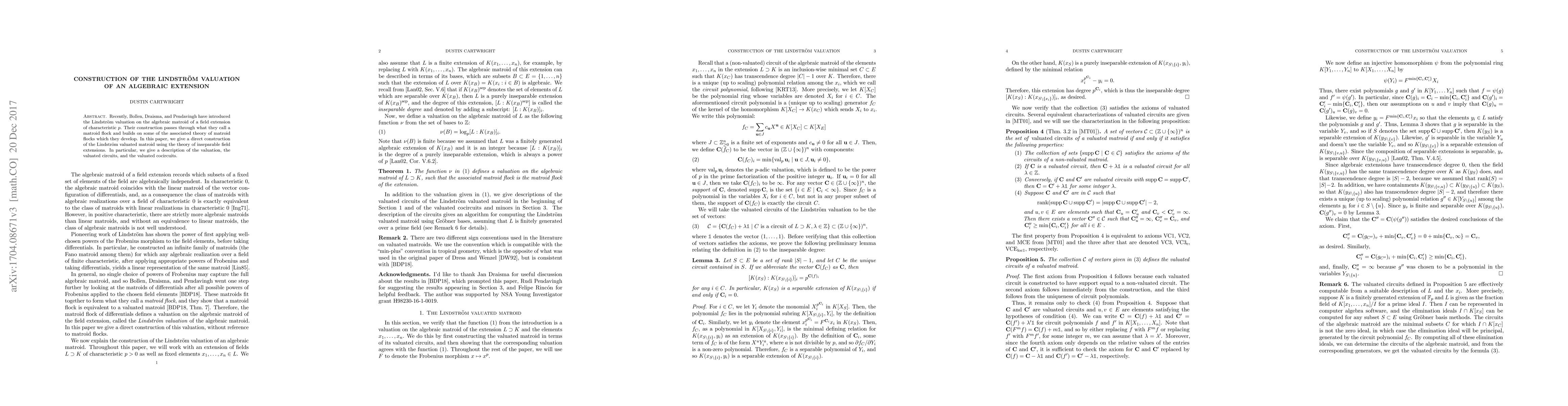 Recently, Bollen, Draisma, and Pendavingh have introduced the Lindstr\"om valuation on the algebraic matroid of a field extension of characteristic p. Their construction passes through what they call a matroid flock and builds on some of the associated theory of matroid flocks which they develop. In this paper, we give a direct construction of the Lindstr\"om valuated matroid using the theory of inseparable field extensions. In particular, we give a description of the valuation, the valuated circuits, and the valuated cocircuits.