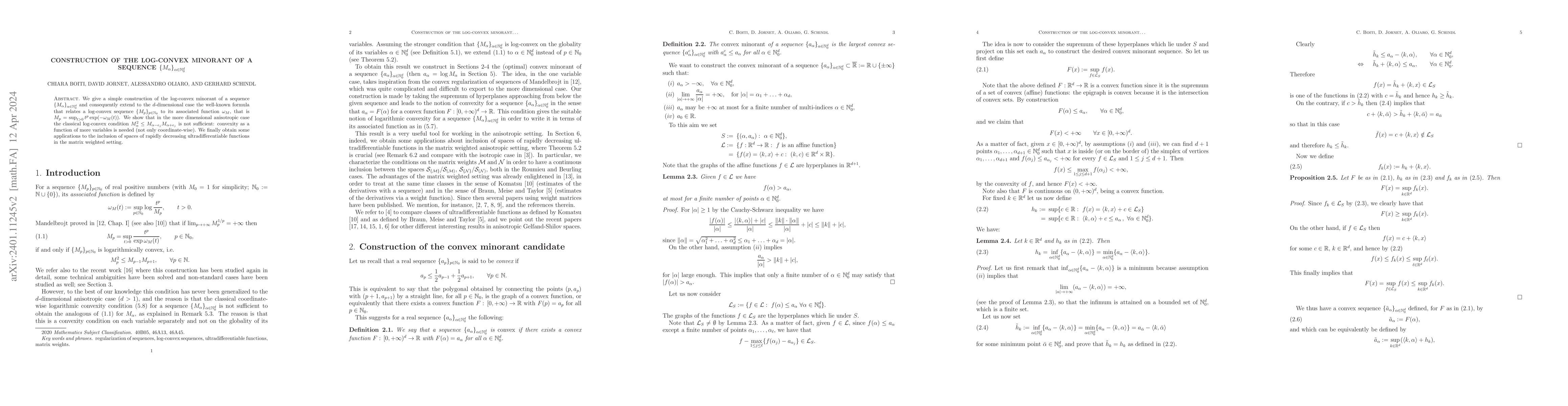 We give a simple construction of the log-convex minorant of a sequence $\{M_\alpha\}_{\alpha\in\mathbb{N}_0^d}$ and consequently extend to the $d$-dimensional case the well-known formula that relates a log-convex sequence $\{M_p\}_{p\in\mathbb{N}_0}$ to its associated function $\omega_M$, that is $M_p=\sup_{t>0}t^p\exp(-\omega_M(t))$. We show that in the more dimensional anisotropic case the classical log-convex condition $M_\alpha^2\leq M_{\alpha-e_j}M_{\alpha+e_j}$ is not sufficient: convexity as a function of more variables is needed (not only coordinate-wise). We finally obtain some applications to the inclusion of spaces of rapidly decreasing ultradifferentiable functions in the matrix weighted setting.