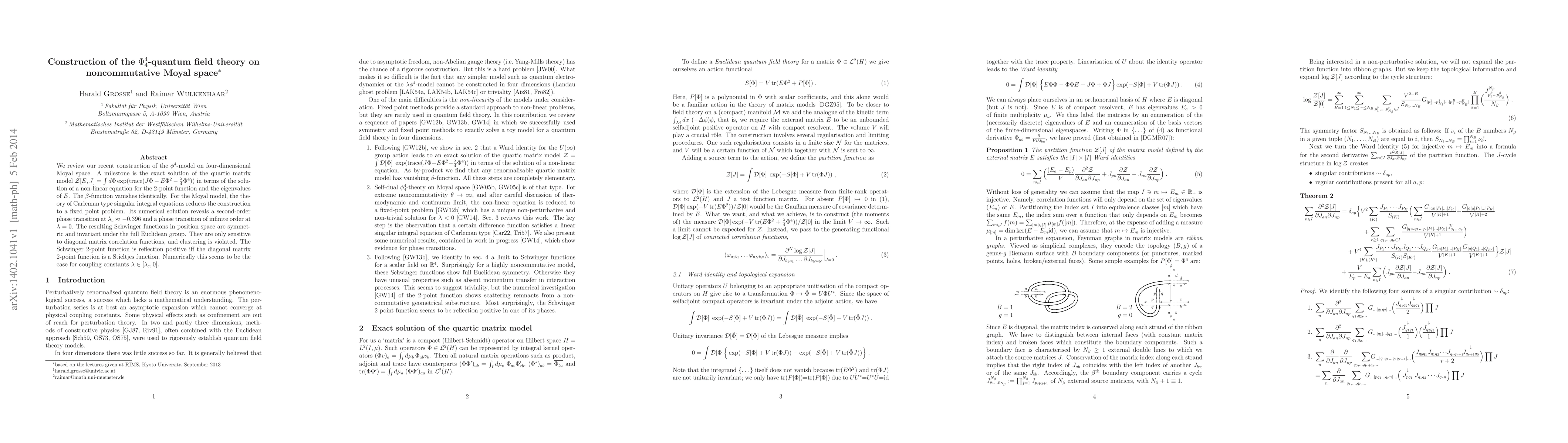 We review our recent construction of the $\phi^4$-model on four-dimensional Moyal space. A milestone is the exact solution of the quartic matrix model $Z[E,J]=\int d\Phi \exp(tr(J\Phi- E\Phi^2 -(\lambda/4) \Phi^4))$ in terms of the solution of a non-linear equation for the 2-point function and the eigenvalues of $E$. The $\beta$-function vanishes identically. For the Moyal model, the theory of Carleman type singular integral equations reduces the construction to a fixed point problem. Its numerical solution reveals a second-order phase transition at $\lambda_c\approx-0.396$ and a phase transition of infinite order at $\lambda=0$. The resulting Schwinger functions in position space are symmetric and invariant under the full Euclidean group. They are only sensitive to diagonal matrix correlation functions, and clustering is violated. The Schwinger 2-point function is reflection positive iff the diagonal matrix 2-point function is a Stieltjes function. Numerically this seems to be the case for coupling constants $\lambda \in [\lambda_c,0]$.