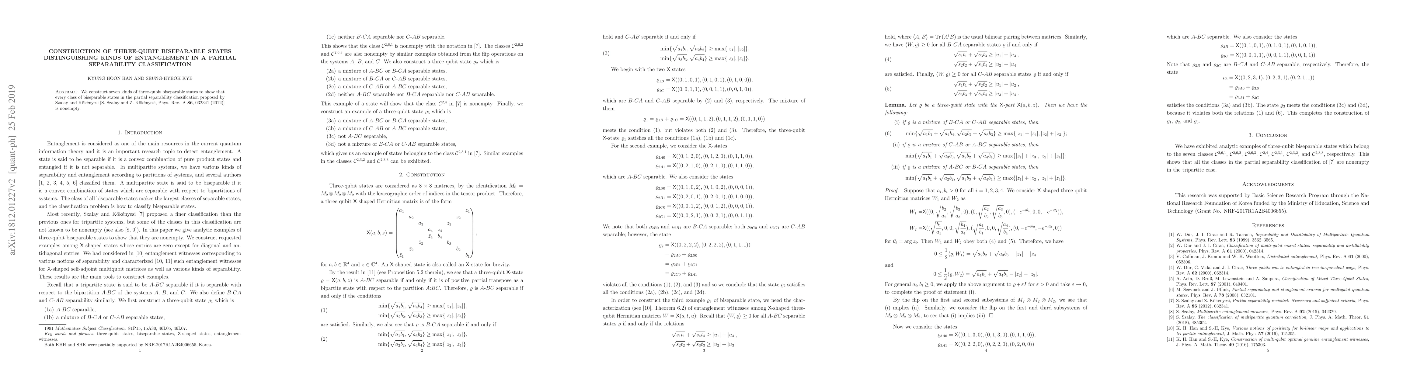 We construct seven kinds of three-qubit biseparable states to show that every class of biseparable states in the partial separability classification proposed by Szalay and K\"ok\'enyesi [S. Szalay and Z. K\"ok\'enyesi, Phys. Rev. A 86, 032341 (2012)] is nonempty.