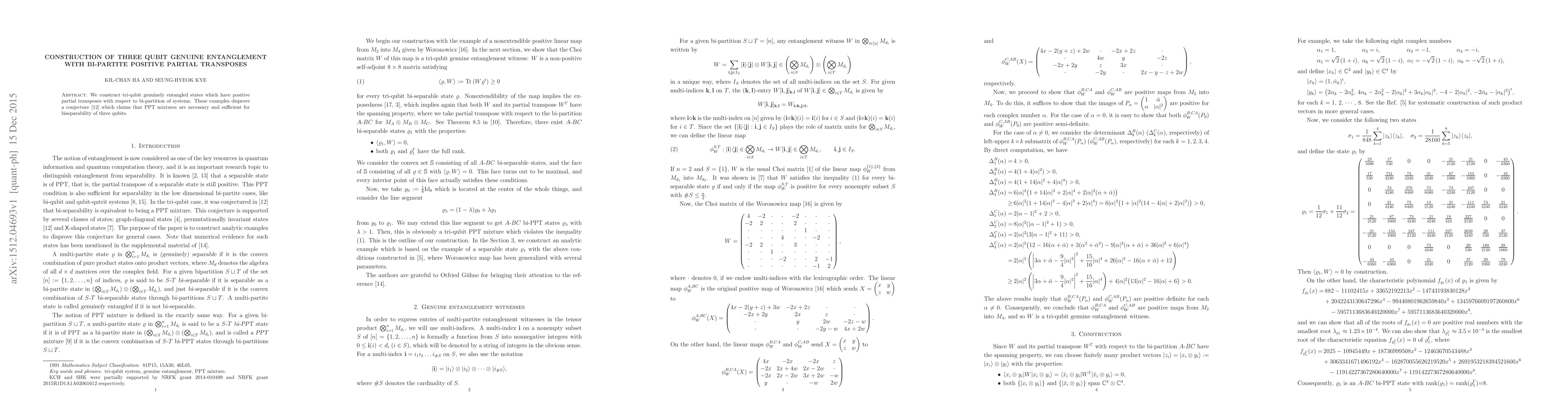 We construct tri-qubit genuinely entangled states which have positive partial transposes with respect to bi-partition of systems. These examples disprove a conjecture [L. Novo, T. Moroder and O. G\" uhne, Phys.Rev.A {88}, 012305 (2013)] which claims that PPT mixtures are necessary and sufficient for biseparability of three qubits.