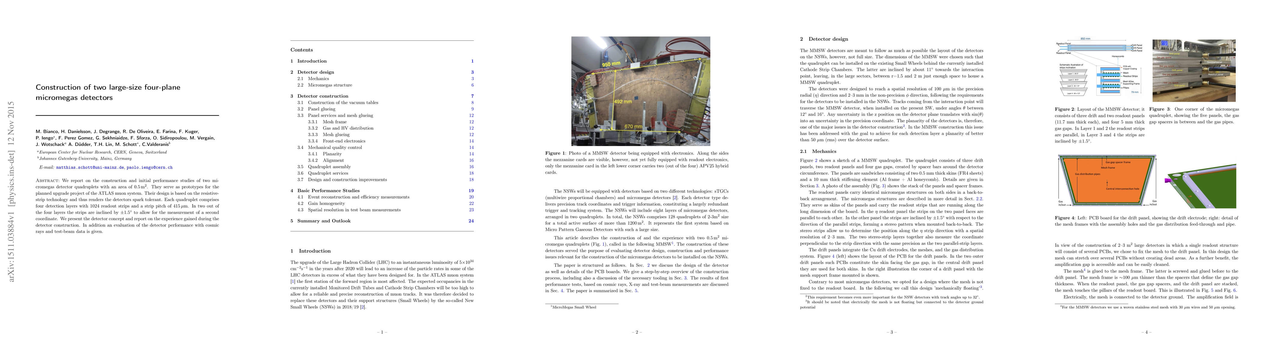 This paper details the construction and initial performance of two large-size four-plane micromegas detectors, each with an area of 0.5 m$^2$, designed for the ATLAS muon system upgrade. The detectors feature resistive-strip technology, ensuring spark tolerance, and include inclined strips for measuring a second coordinate.