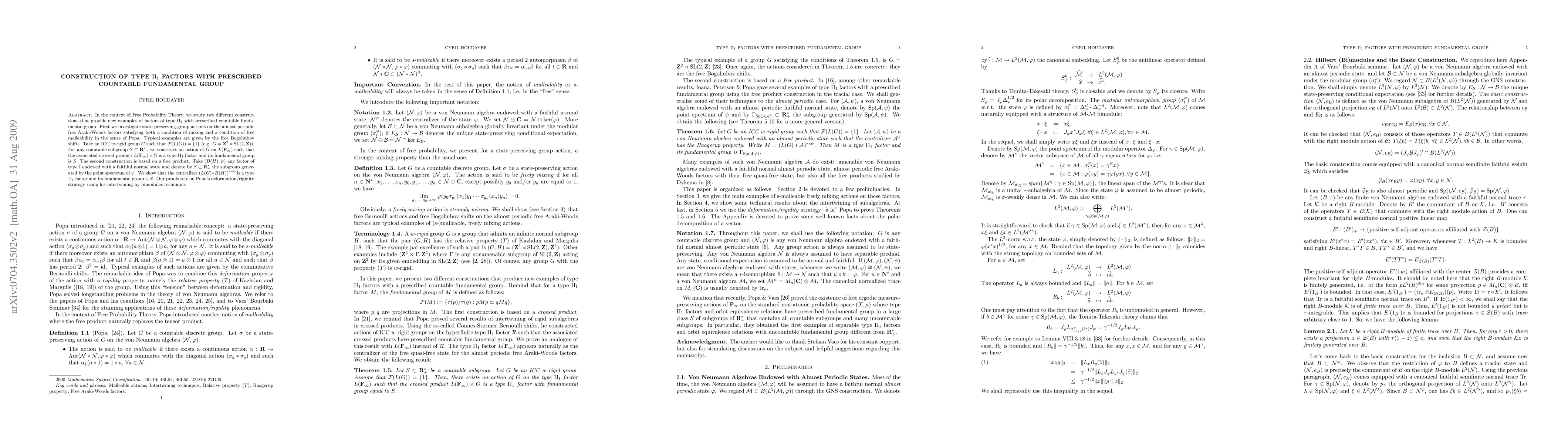 In the context of Free Probability Theory, we study two different constructions that provide new examples of factors of type ${\rm II_1}$ with prescribed fundamental group. First we investigate state-preserving group actions on the almost periodic free Araki-Woods factors satisfying both a condition of mixing and a condition of free malleability in the sense of Popa. Typical examples are given by the free Bogoliubov shifts. Take an ICC $w$-rigid group $G$ such that $\mathcal{F}(L(G)) = \{1\}$ (e.g. $G = \Z^2 \rtimes \SL(2, \Z)$). For any countable subgroup $S \subset \R^*_+$, we show that there exists an action of $G$ on $L(\F_\infty)$ such that $L(\F_\infty) \rtimes G$ is a type ${\rm II_1}$ factor and its fundamental group is $S$. The second construction is based on a free product. Take $(B(H), \psi)$ any factor of type ${\rm I}$ endowed with a faithful normal state and denote by $\Gamma \subset \R^*_+$ the subgroup generated by the point spectrum of $\psi$. We show that the centralizer $(L(G) \ast B(H))^{\tau \ast \psi}$ is a type ${\rm II_1}$ factor and its fundamental group is $\Gamma$. Our proofs rely on Popa's deformation/rigidity strategy using his intertwining-by-bimodules technique.