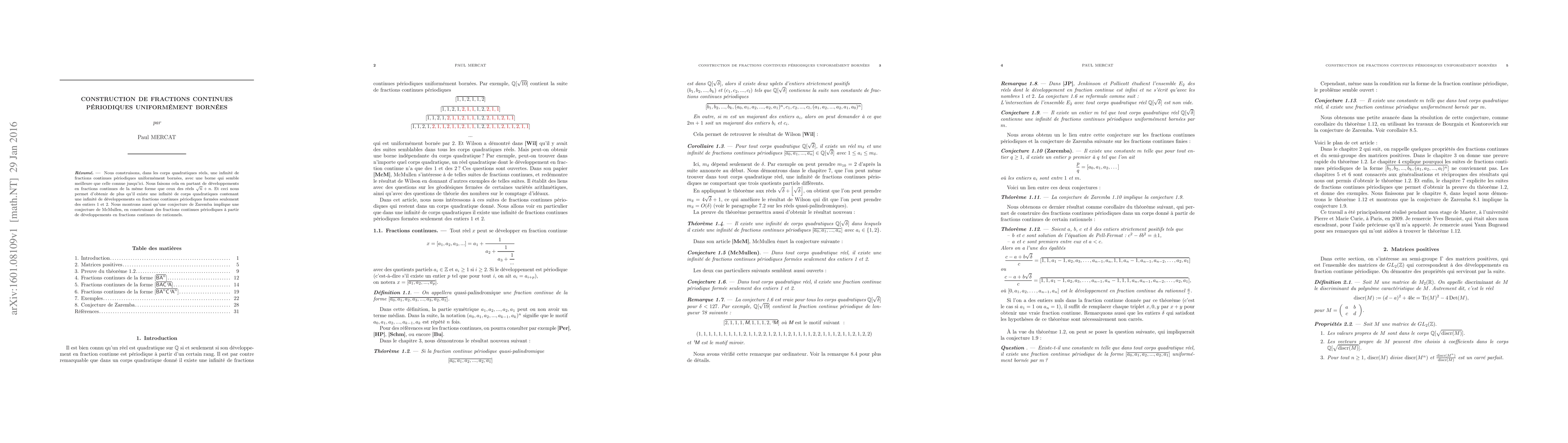 We build, for real quadratic fields, infinitely many periodic continuous fractions uniformly bounded, with a seemingly better bound than the known ones. We do that using continuous fraction expansions with the same shape as those of real numbers sqrt(n) + n. It allows us to obtain that there exist infinitely many quadratic fields containing infinitely many continuous fraction expansions formed only by integers 1 and 2. We also prove that a conjecture of Zaremba implies a conjecture of McMullen, building periodic continuous fractions from continued fraction expansions of rational numbers.
