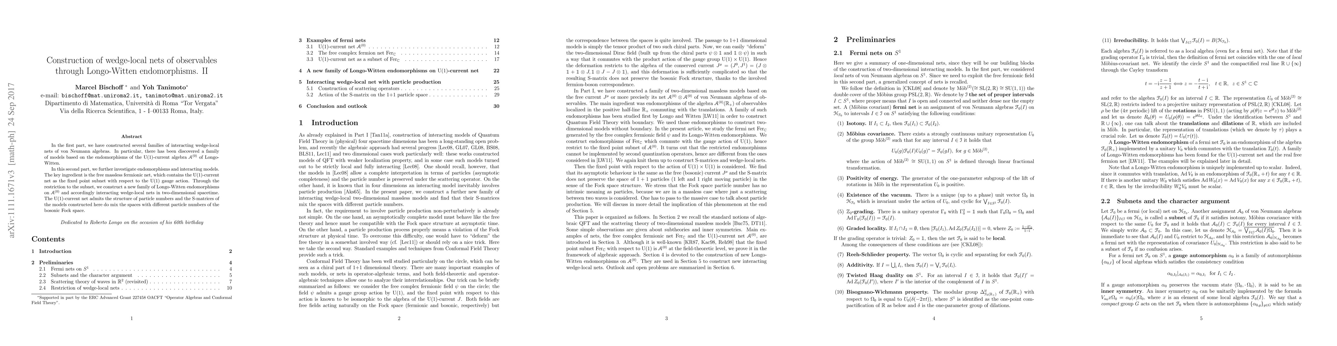In the first part, we have constructed several families of interacting wedge-local nets of von Neumann algebras. In particular, there has been discovered a family of models based on the endomorphisms of the U(1)-current algebra of Longo-Witten. In this second part, we further investigate endomorphisms and interacting models. The key ingredient is the free massless fermionic net, which contains the U(1)-current net as the fixed point subnet with respect to the U(1) gauge action. Through the restriction to the subnet, we construct a new family of Longo-Witten endomorphisms on the U(1)-current net and accordingly interacting wedge-local nets in two-dimensional spacetime. The U(1)-current net admits the structure of particle numbers and the S-matrices of the models constructed here do mix the spaces with different particle numbers of the bosonic Fock space.