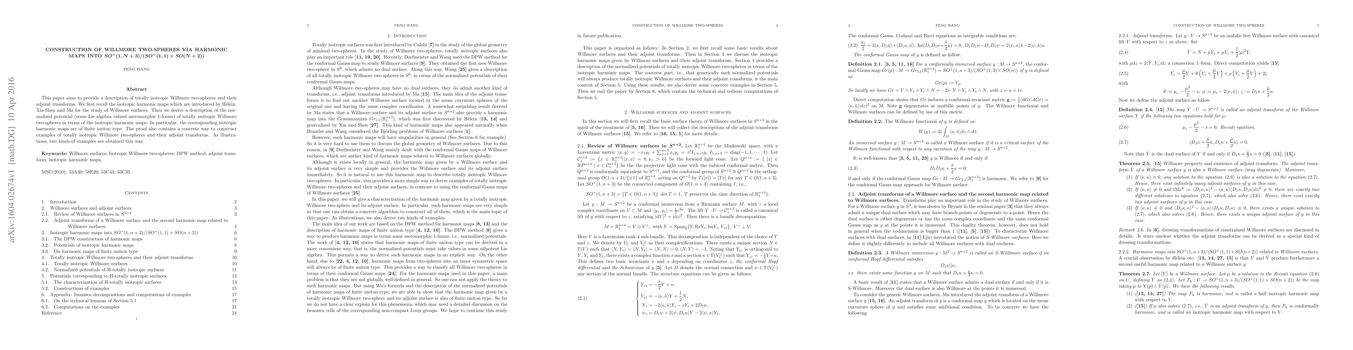 This paper aims to provide a description of totally isotropic Willmore two-spheres and their adjoint transforms. We first recall the isotropic harmonic maps which are introduced by H\'elein, Xia-Shen and Ma for the study of Willmore surfaces. Then we derive a description of the normalized potential (some Lie algebra valued meromorphic 1-forms) of totally isotropic Willmore two-spheres in terms of the isotropic harmonic maps. In particular, the corresponding isotropic harmonic maps are of finite uniton type. The proof also contains a concrete way to construct examples of totally isotropic Willmore two-spheres and their adjoint transforms. As illustrations, two kinds of examples are obtained this way.