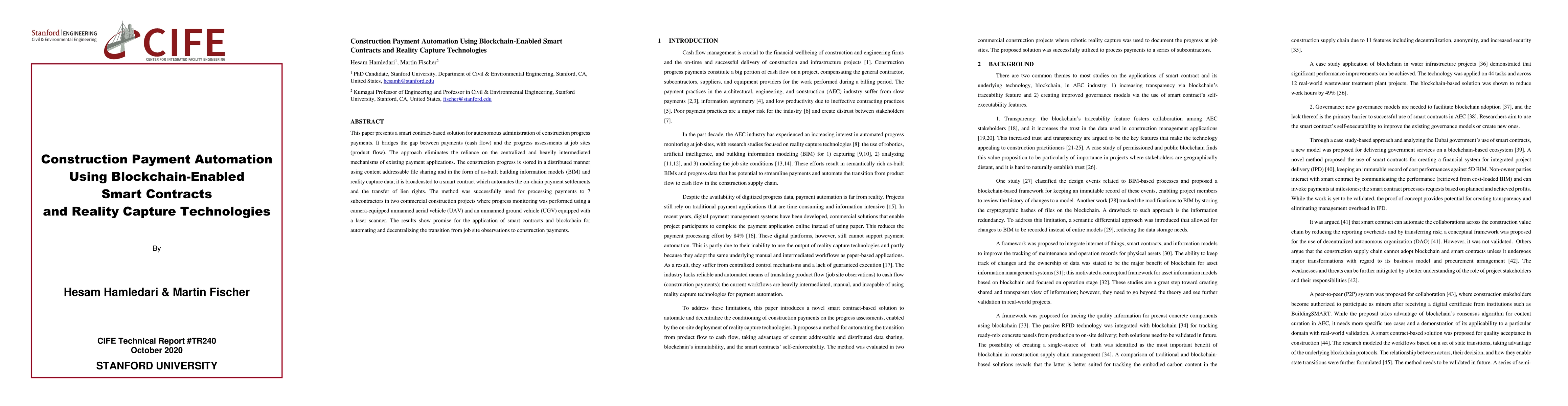 This paper proposes a blockchain-based smart contract solution for automating construction progress payments, leveraging reality capture and BIM to enhance payment transparency and frequency. The method was tested in two commercial projects, showing potential for improved project management through a new singleton state machine model.