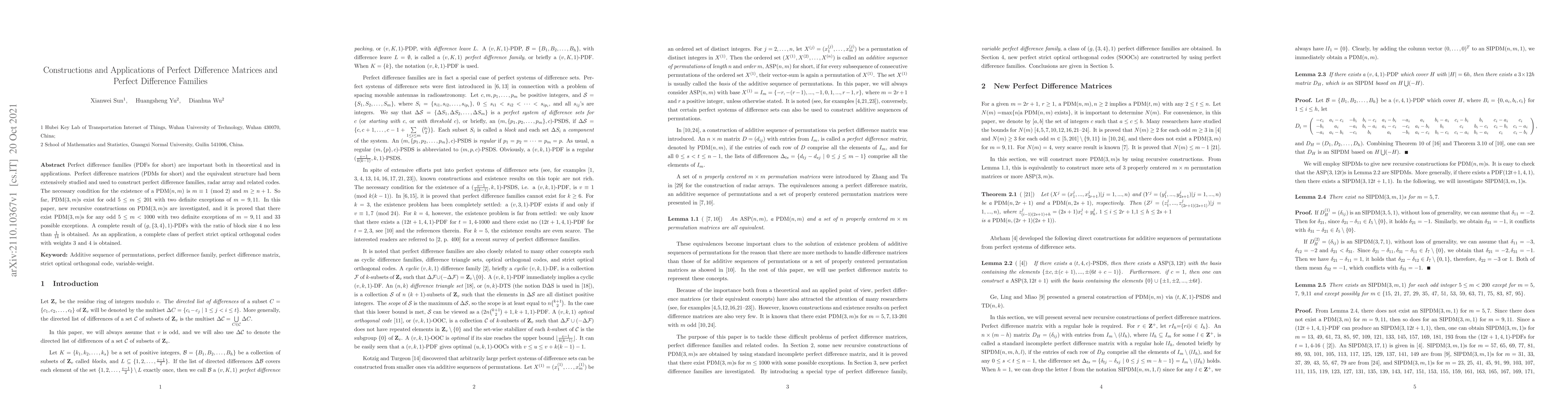Perfect difference families (PDFs for short) are important both in theoretical and in applications. Perfect difference matrices (PDMs for short) and the equivalent structure had been extensively studied and used to construct perfect difference families, radar array and related codes. The necessary condition for the existence of a PDM$(n,m)$ is $m\equiv 1\pmod2$ and $m\geq n+1$. So far, PDM$(3,m)$s exist for odd $5\leq m\leq 201$ with two definite exceptions of $m=9,11$. In this paper, new recursive constructions on PDM$(3,m)$s are investigated, and it is proved that there exist PDM$(3,m)$s for any odd $5\leq m<1000$ with two definite exceptions of $m=9,11$ and $33$ possible exceptions. A complete result of $(g,\{3,4\},1)$-PDFs with the ratio of block size $4$ no less than $\frac{1}{14}$ is obtained. As an application, a complete class of perfect strict optical orthogonal codes with weights $3$ and $4$ is obtained.