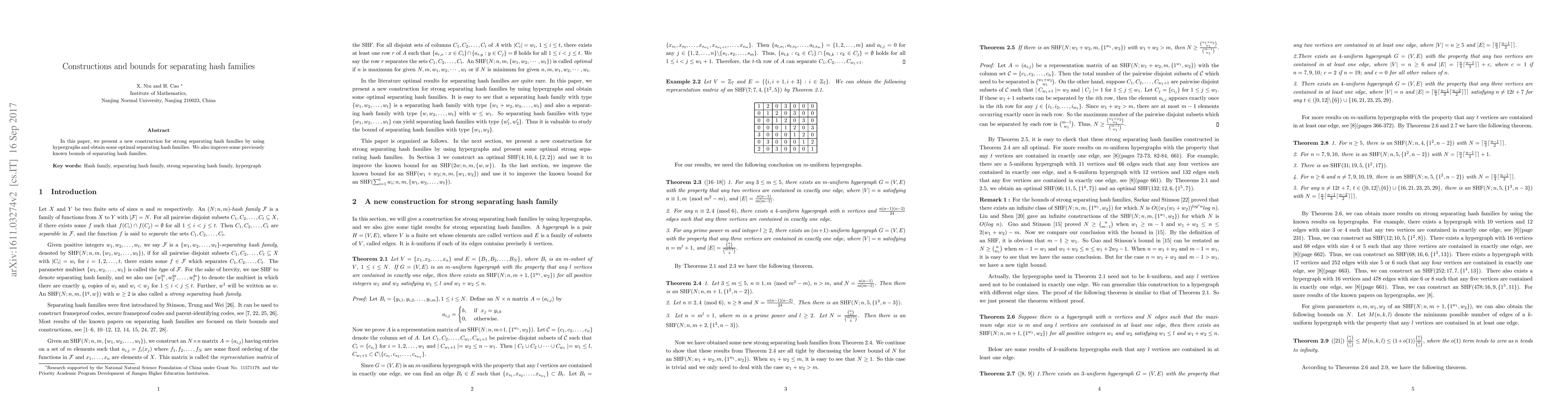 Summary: This paper introduces a novel construction of strong separating hash families via hypergraphs and achieves optimal separating hash families, while also enhancing the previously known bounds for these hash families.