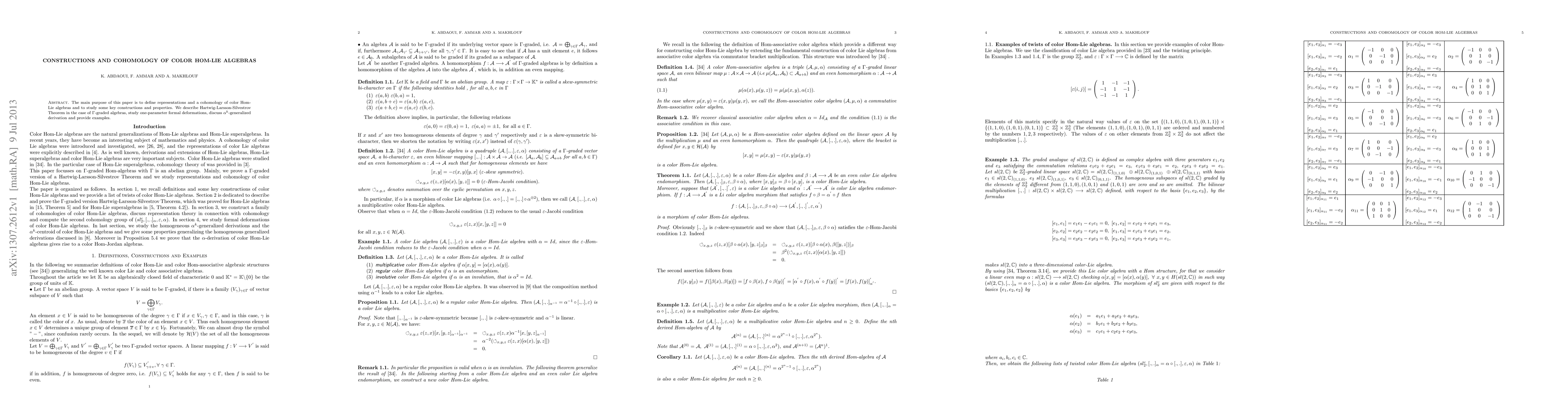 This paper defines representations and cohomology for color Hom-Lie algebras, exploring constructions and properties. It includes a discussion on Hartwig-Larsson-Silvestrov Theorem for $\Gamma$-graded algebras, one-parameter formal deformations, and $\alpha^{k}$-generalized derivations, supplemented by illustrative examples.