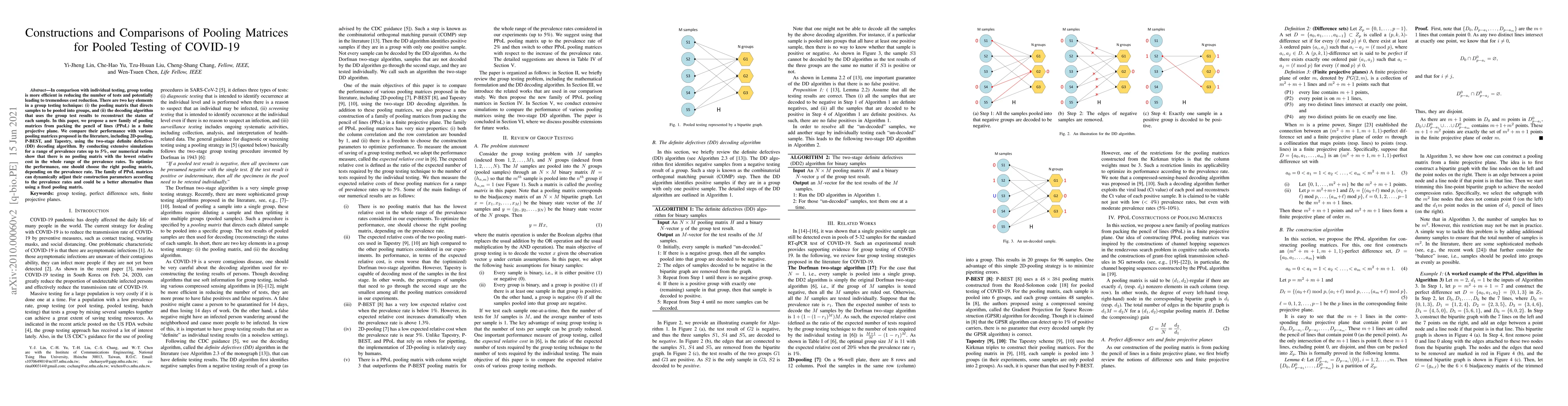 In comparison with individual testing, group testing (also known as pooled testing) is more efficient in reducing the number of tests and potentially leading to tremendous cost reduction. As indicated in the recent article posted on the US FDA website, the group testing approach for COVID-19 has received a lot of interest lately. There are two key elements in a group testing technique: (i) the pooling matrix that directs samples to be pooled into groups, and (ii) the decoding algorithm that uses the group test results to reconstruct the status of each sample. In this paper, we propose a new family of pooling matrices from packing the pencil of lines (PPoL) in a finite projective plane. We compare their performance with various pooling matrices proposed in the literature, including 2D-pooling, P-BEST, and Tapestry, using the two-stage definite defectives (DD) decoding algorithm. By conducting extensive simulations for a range of prevalence rates up to 5%, our numerical results show that there is no pooling matrix with the lowest relative cost in the whole range of the prevalence rates. To optimize the performance, one should choose the right pooling matrix, depending on the prevalence rate. The family of PPoL matrices can dynamically adjust their column weights according to the prevalence rates and could be a better alternative than using a fixed pooling matrix.