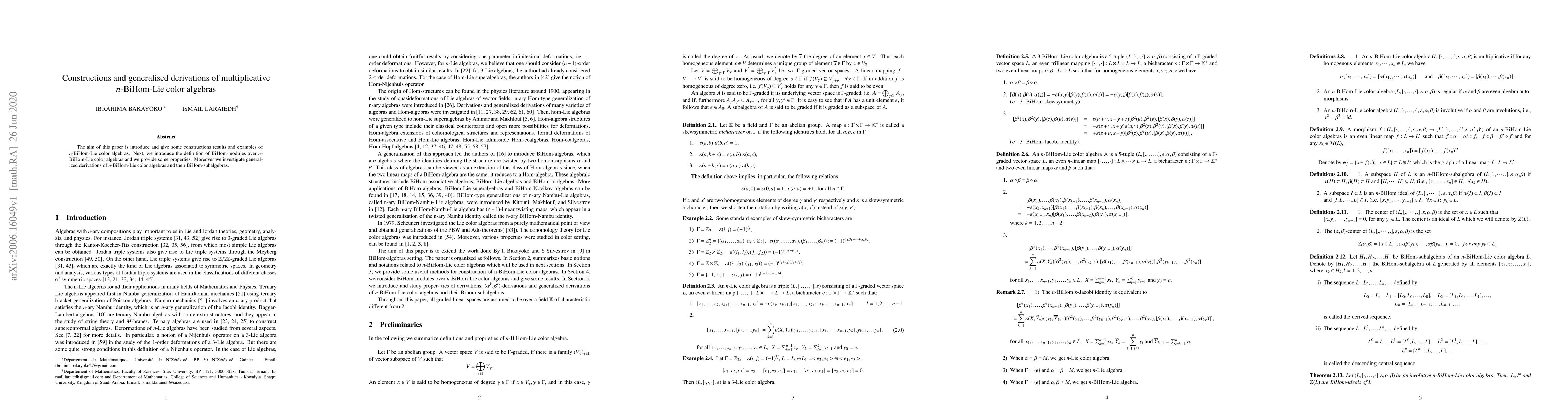 Summary: This paper introduces n-BiHom-Lie color algebras, providing constructions and examples, as well as defining BiHom-modules over these algebras. It also examines generalized derivations and their properties in relation to these algebras and their BiHom-subalgebras.