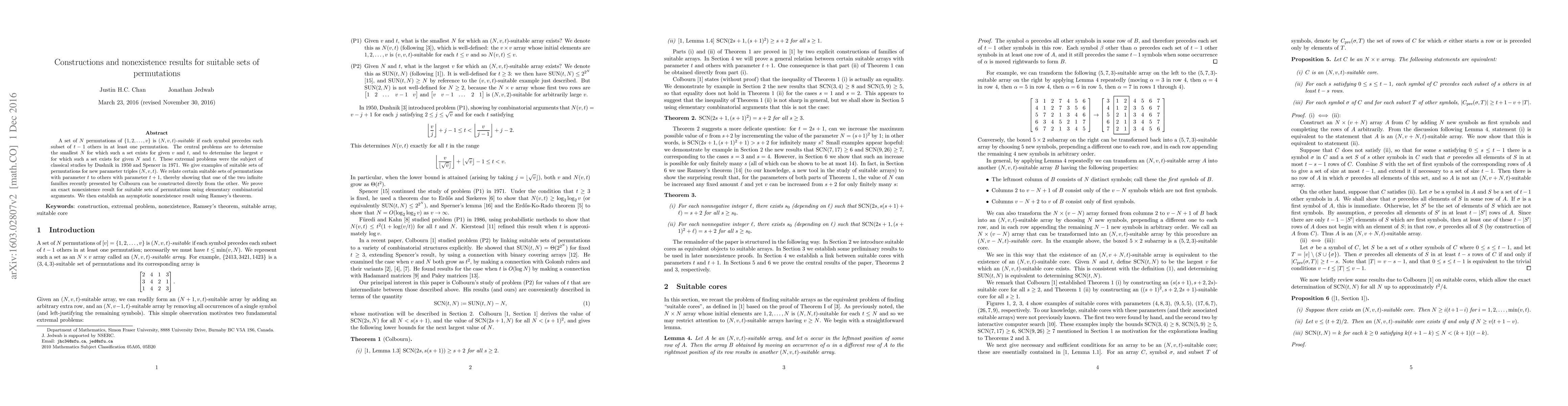 Researchers investigate suitable sets of permutations with specific properties, providing examples and proving nonexistence results using combinatorial arguments and Ramsey's theorem.