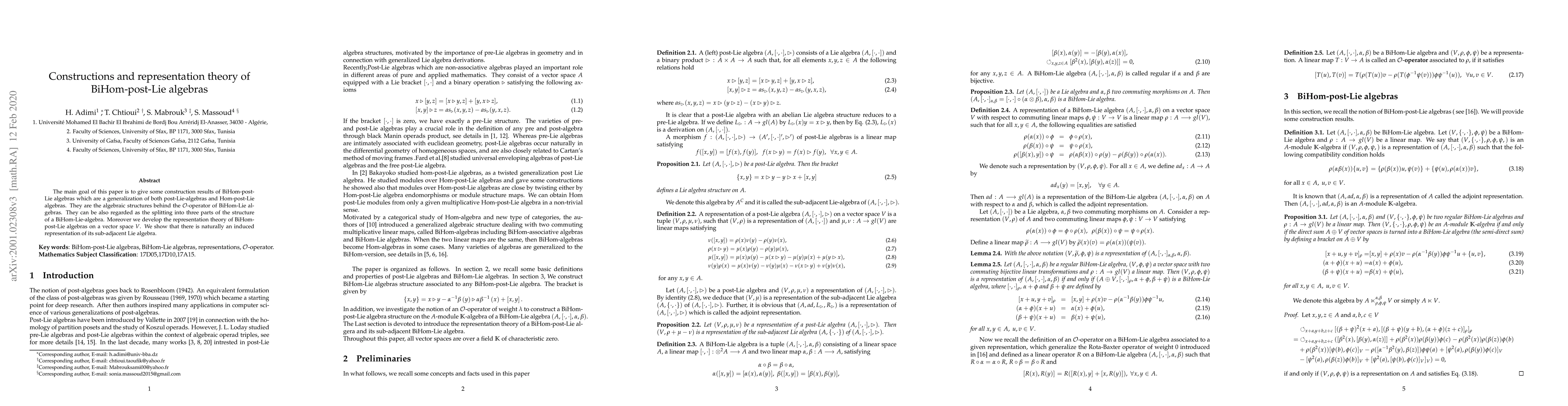 The main goal of this paper is to give some construction results of BiHom-post-Lie algebras which are a generalization of both post-Lie-algebras and Hom-post-Lie algebras. They are the algebraic structures behind the $\mathcal{O}$-operator of BiHom-Lie algebras. They can be also regarded as the splitting into three parts of the structure of a BiHom-Lie-algebra. Moreover we develop the representation theory of BiHom-post-Lie algebras on a vector space $V$. We show that there is naturally an induced representation of its sub-adjacent Lie algebra.