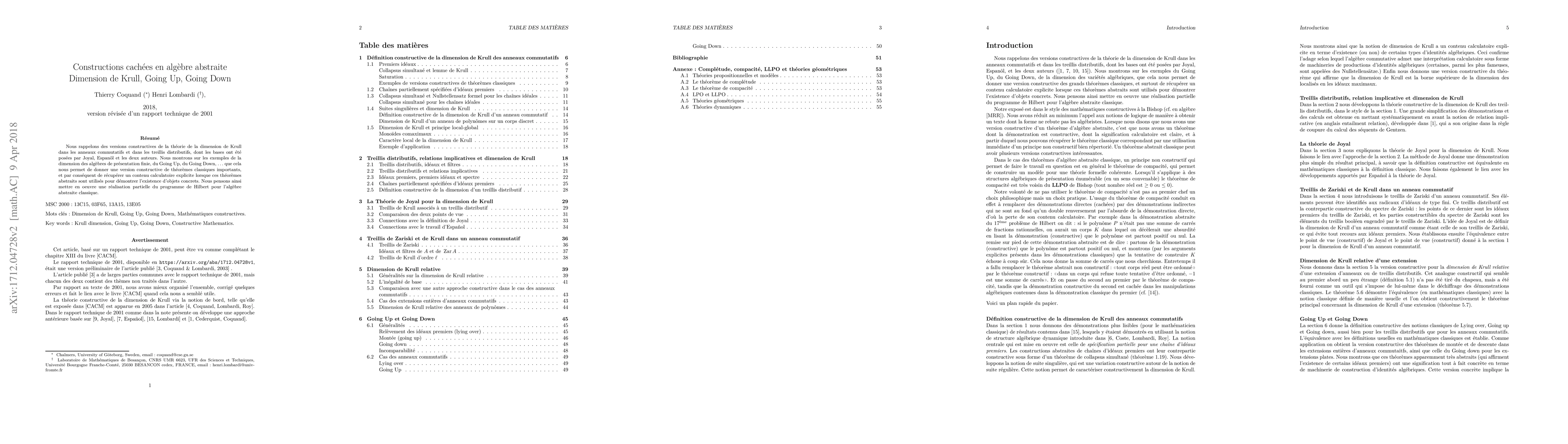 This paper presents constructive versions of Krull dimension theory for commutative rings and distributive lattices, providing explicit computational content for classical theorems like the dimension of finitely presented algebras and the Going Up and Going Down theorems. This work aims to partially realize Hilbert's program for classical abstract algebra.