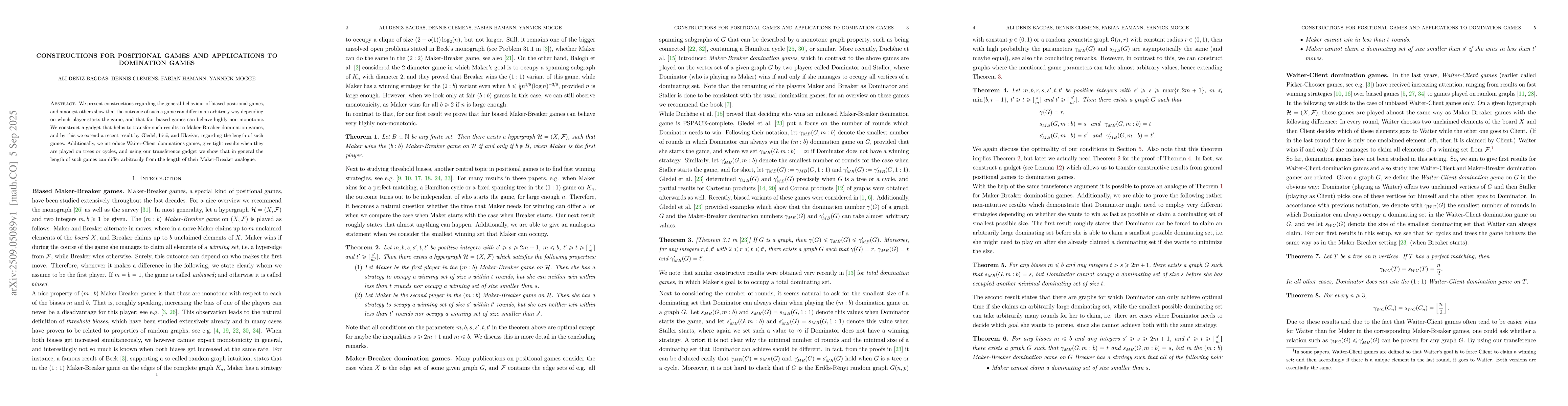 We present constructions regarding the general behaviour of biased positional games, and amongst others show that the outcome of such a game can differ in an arbitrary way depending on which player starts the game, and that fair biased games can behave highly non-monotonic. We construct a gadget that helps to transfer such results to Maker-Breaker domination games, and by this we extend a recent result by Gledel, Ir\v{s}i\v{c}, and Klav\v{z}ar, regarding the length of such games. Additionally, we introduce Waiter-Client dominations games, give tight results when they are played on trees or cycles, and using our transference gadget we show that in general the length of such games can differ arbitrarily from the length of their Maker-Breaker analogue.
