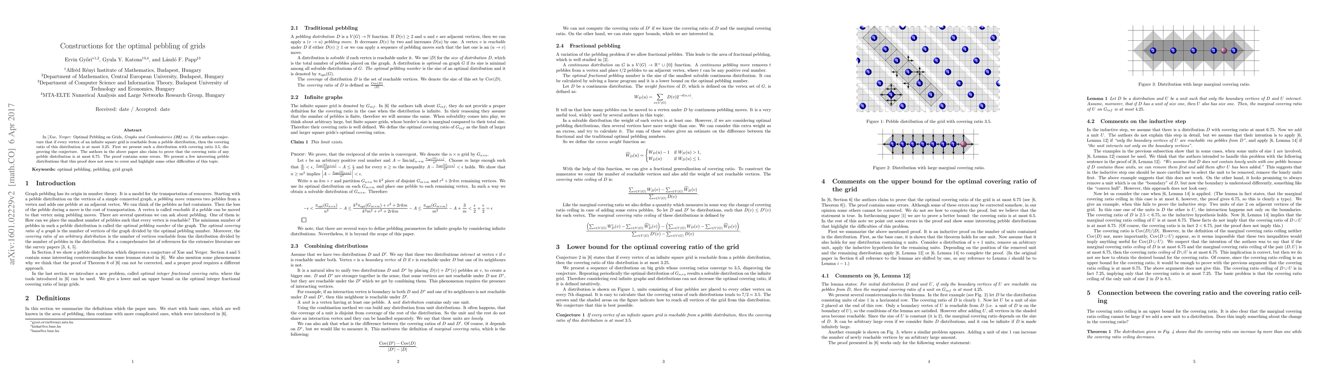 In [C. Xue, C. Yerger: Optimal Pebbling on Grids, Graphs and Combinatorics] the authors conjecture that if every vertex of an infinite square grid is reachable from a pebble distribution, then the covering ratio of this distribution is at most $3.25$. First we present such a distribution with covering ratio $3.5$, disproving the conjecture. The authors in the above paper also claim to prove that the covering ratio of any pebble distribution is at most $6.75$. The proof contains some errors. We present a few interesting pebble distributions that this proof does not seem to cover and highlight some other difficulties of this topic.