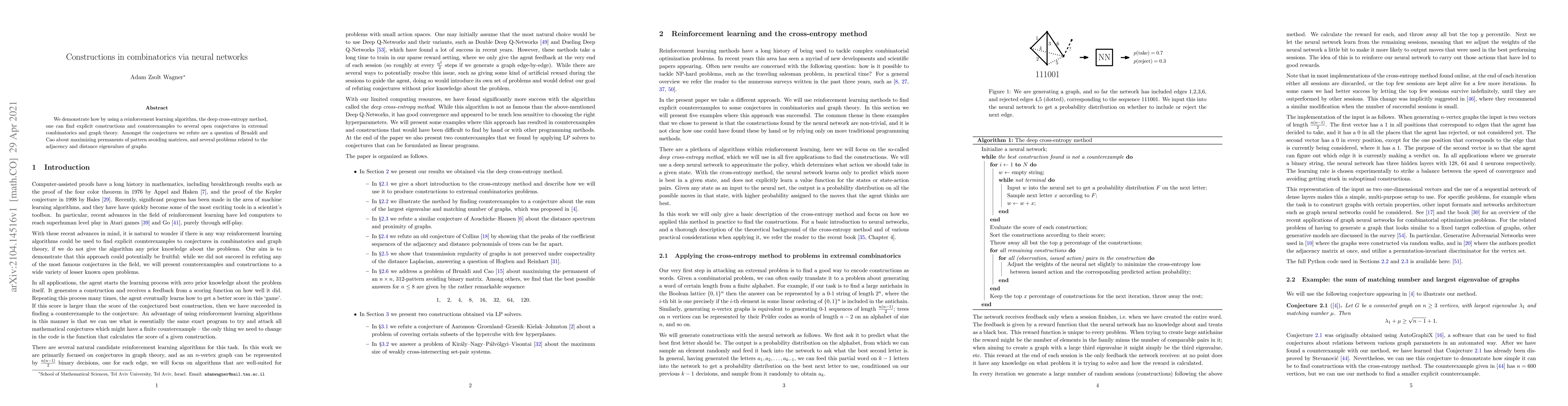 We demonstrate how by using a reinforcement learning algorithm, the deep cross-entropy method, one can find explicit constructions and counterexamples to several open conjectures in extremal combinatorics and graph theory. Amongst the conjectures we refute are a question of Brualdi and Cao about maximizing permanents of pattern avoiding matrices, and several problems related to the adjacency and distance eigenvalues of graphs.