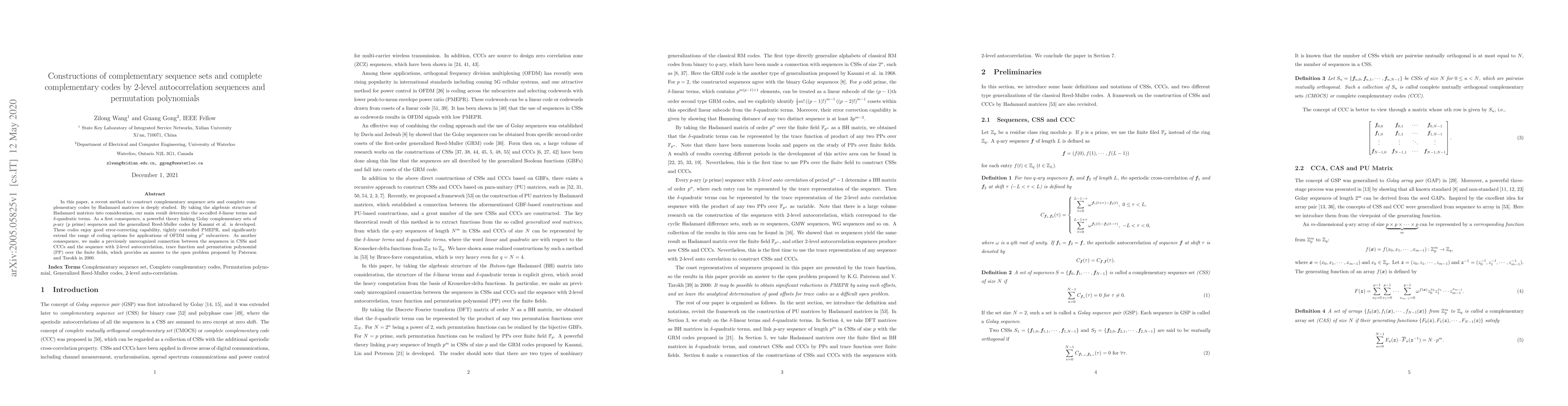 In this paper, a recent method to construct complementary sequence sets and complete complementary codes by Hadamard matrices is deeply studied. By taking the algebraic structure of Hadamard matrices into consideration, our main result determine the so-called $\delta$-linear terms and $\delta$-quadratic terms. As a first consequence, a powerful theory linking Golay complementary sets of $p$-ary ($p$ prime) sequences and the generalized Reed-Muller codes by Kasami et al. is developed. These codes enjoy good error-correcting capability, tightly controlled PMEPR, and significantly extend the range of coding options for applications of OFDM using $p^n$ subcarriers. As another consequence, we make a previously unrecognized connection between the sequences in CSSs and CCCs and the sequence with 2-level autocorrelation, trace function and permutation polynomial (PP) over the finite fields.