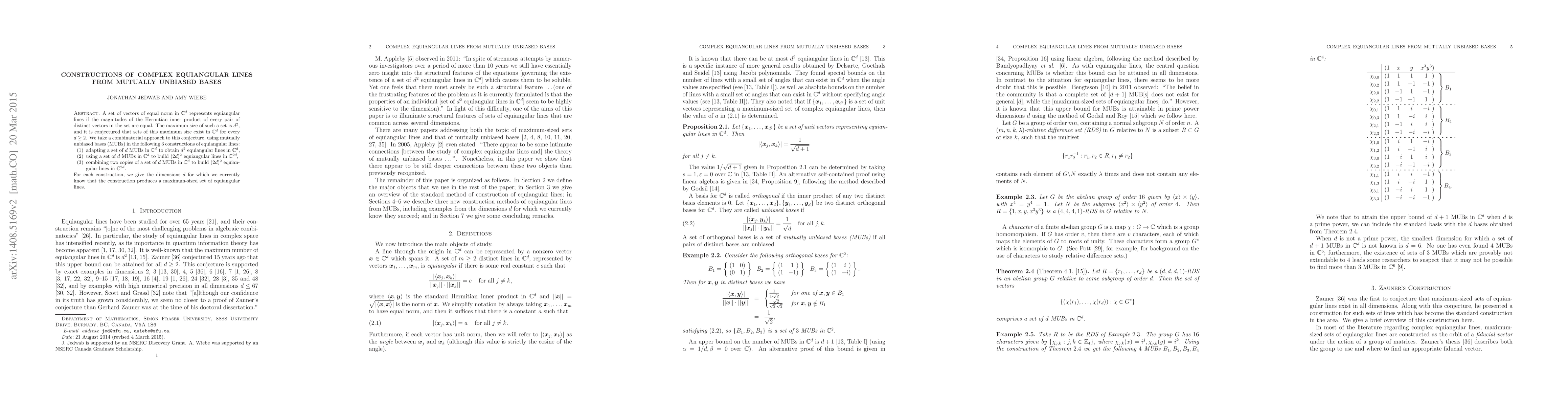 A set of vectors of equal norm in $\mathbb{C}^d$ represents equiangular lines if the magnitudes of the Hermitian inner product of every pair of distinct vectors in the set are equal. The maximum size of such a set is $d^2$, and it is conjectured that sets of this maximum size exist in $\mathbb{C}^d$ for every $d \geq 2$. We take a combinatorial approach to this conjecture, using mutually unbiased bases (MUBs) in the following 3 constructions of equiangular lines: (1) adapting a set of $d$ MUBs in $\mathbb{C}^d$ to obtain $d^2$ equiangular lines in $\mathbb{C}^d$, (2) using a set of $d$ MUBs in $\mathbb{C}^d$ to build $(2d)^2$ equiangular lines in $\mathbb{C}^{2d}$, (3) combining two copies of a set of $d$ MUBs in $\mathbb{C}^d$ to build $(2d)^2$ equiangular lines in $\mathbb{C}^{2d}$. For each construction, we give the dimensions $d$ for which we currently know that the construction produces a maximum-sized set of equiangular lines.