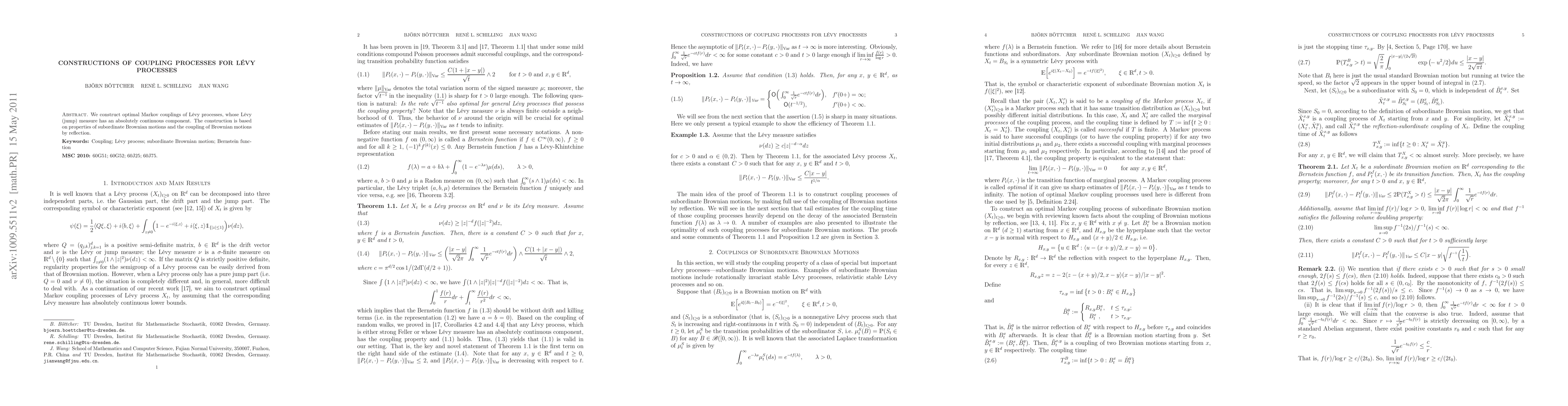 Summary: This paper constructs optimal Markov couplings for Lévy processes with an absolutely continuous component in their Lévy measure, utilizing properties of subordinate Brownian motions and the reflection principle for coupling Brownian motions.