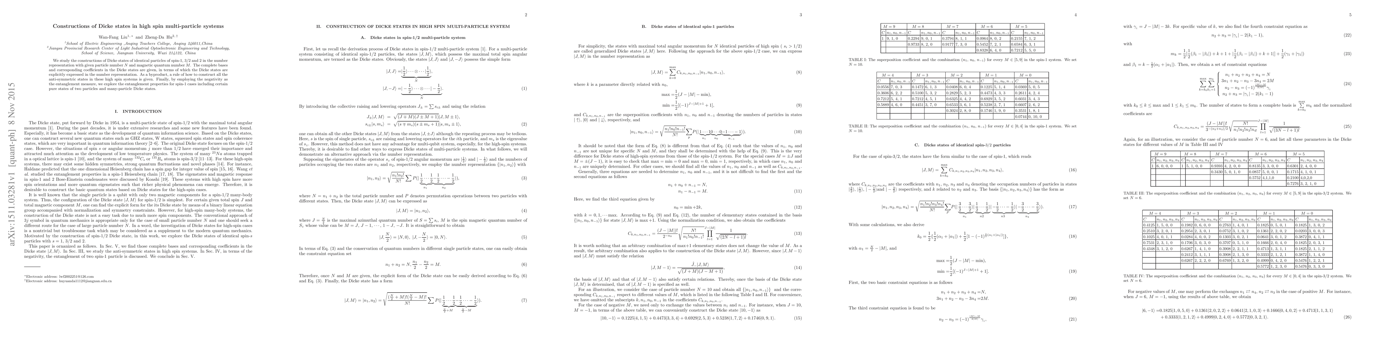 This paper constructs Dicke states for particles of spin-$1$, $3/2$, and $2$ in high spin multi-particle systems, providing complete bases and coefficients for explicit expressions in the number representation. It also explores the entanglement properties of spin-$1$ cases using negativity as a measure.