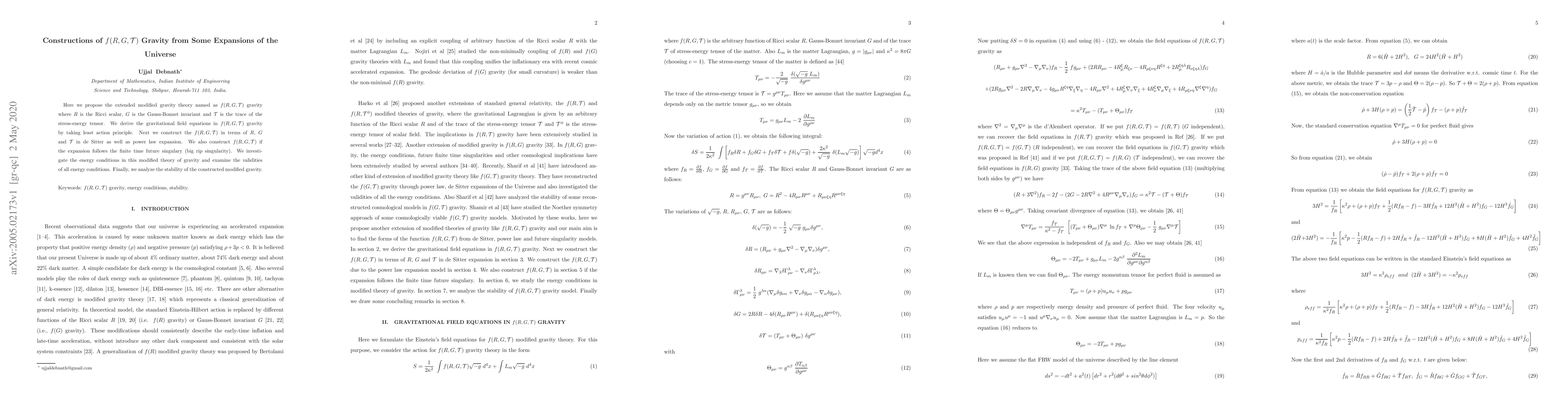Here we propose the extended modified gravity theory named as $f(R,G,\mathcal{T})$ gravity where $R$ is the Ricci scalar, $G$ is the Gauss-Bonnet invariant and $\mathcal{T}$ is the trace of the stress-energy tensor. We derive the gravitational field equations in $f(R,G,\mathcal{T})$ gravity by taking least action principle. Next we construct the $f(R,G,\mathcal{T})$ in terms of $R$, $G$ and $\mathcal{T}$ in de Sitter as well as power law expansion. We also construct $f(R,G,\mathcal{T})$ if the expansion follows the finite time future singulary (big rip singularity). We investigate the energy conditions in this modified theory of gravity and examine the validities of all energy conditions. Finally, we analyze the stability of the constructed modified gravity.