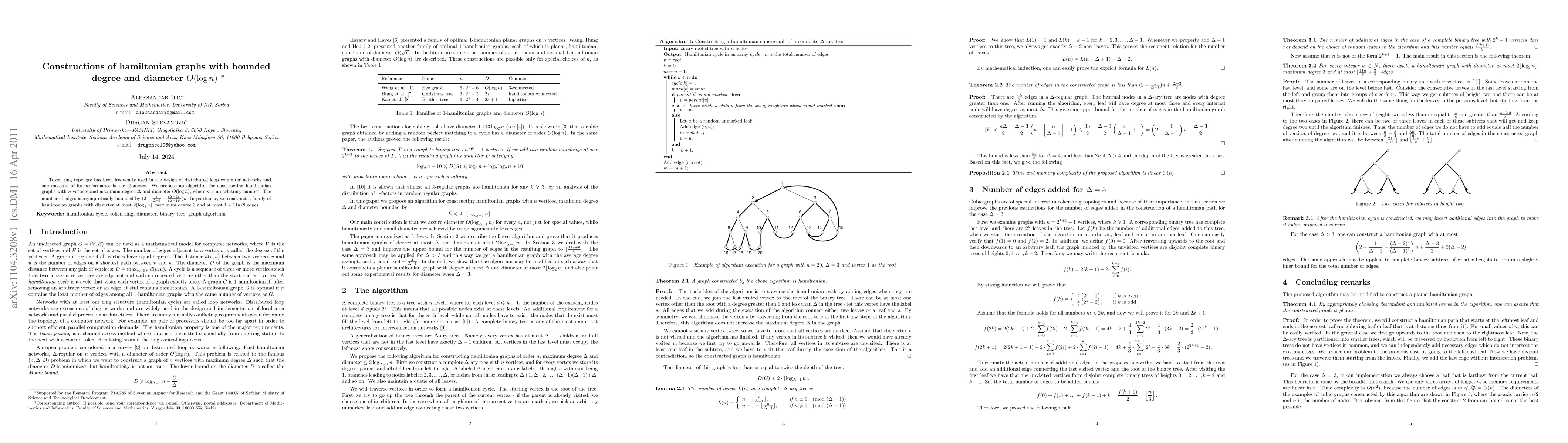 This paper proposes an algorithm for constructing hamiltonian graphs with $n$ vertices, maximum degree $\Delta$, and diameter $O(\log n)$. It specifically constructs a family of such graphs with a maximum degree of 3 and at most $1+11n/8$ edges.
