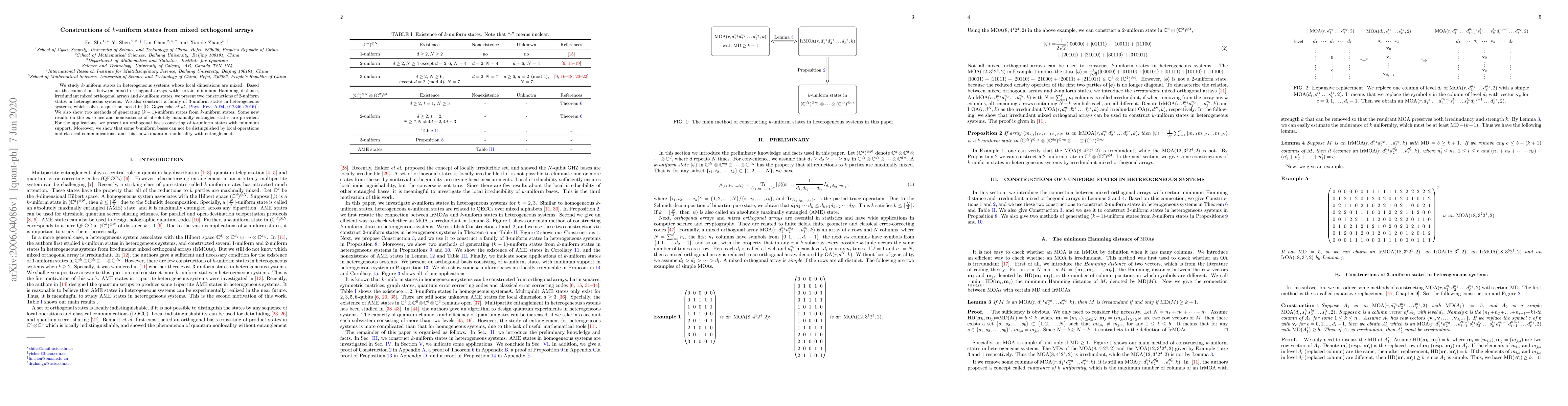 This paper explores the construction of $k$-uniform states in heterogeneous systems using mixed orthogonal arrays, presenting two constructions for $2$-uniform states and a family for $3$-uniform states. It also introduces methods to generate $(k-1)$-uniform states from $k$-uniform states and discusses the existence and nonexistence of absolutely maximally entangled states, highlighting quantum nonlocality with entanglement.