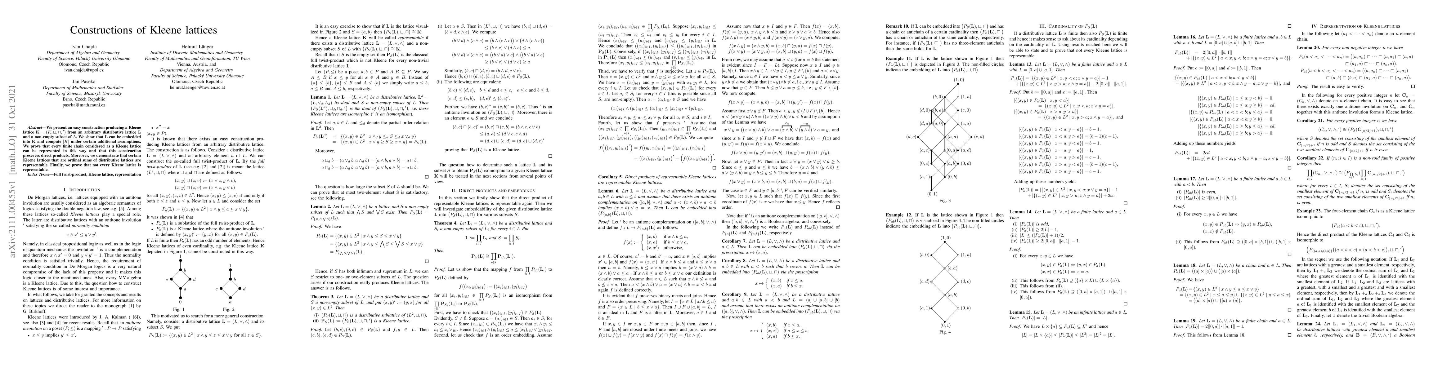 This paper constructs a Kleene lattice K from an arbitrary distributive lattice L and a non-empty subset, showing L can be embedded into K and proving that this construction preserves direct products and represents finite chains as Kleene lattices. However, it concludes that not all Kleene lattices are representable.