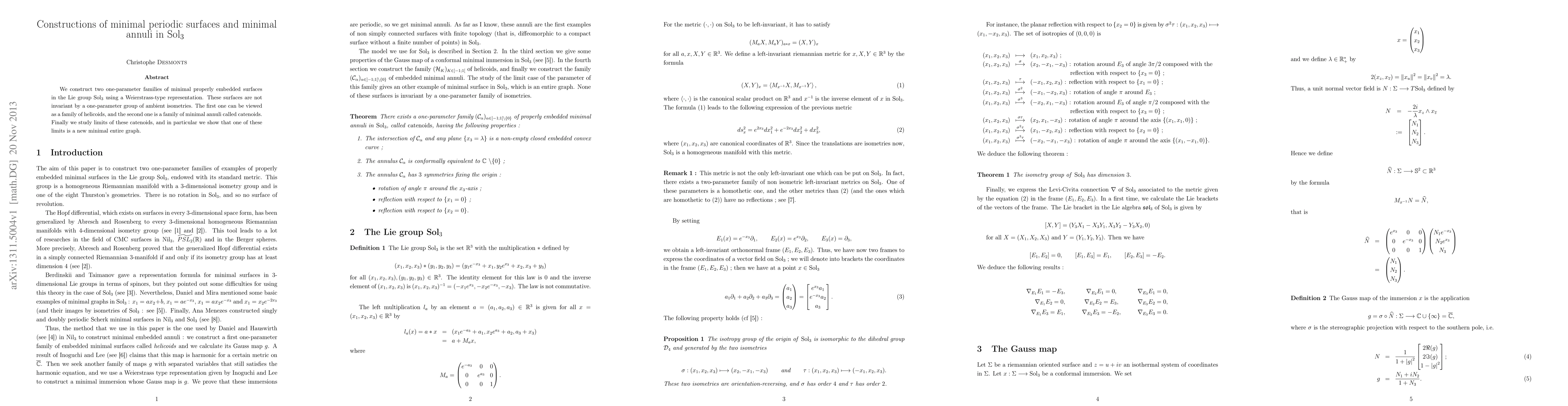 This paper constructs two families of minimal surfaces in Sol3: helicoids and catenoids, using a Weierstrass-type representation. It also explores the limits of these catenoids, revealing a new minimal entire graph.