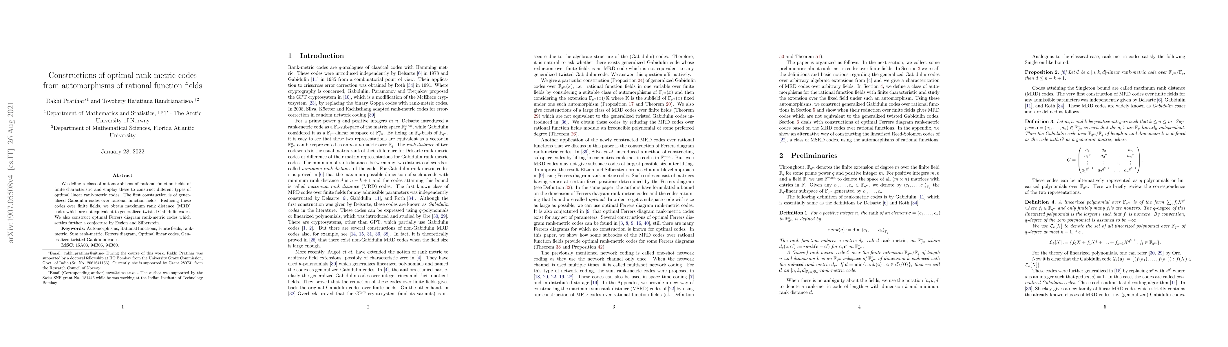 This paper constructs optimal rank-metric codes using automorphisms of rational function fields, leading to generalized Gabidulin codes and optimal Ferrers diagram rank-metric codes, thus resolving a conjecture and providing MRD codes different from generalized twisted Gabidulin codes.