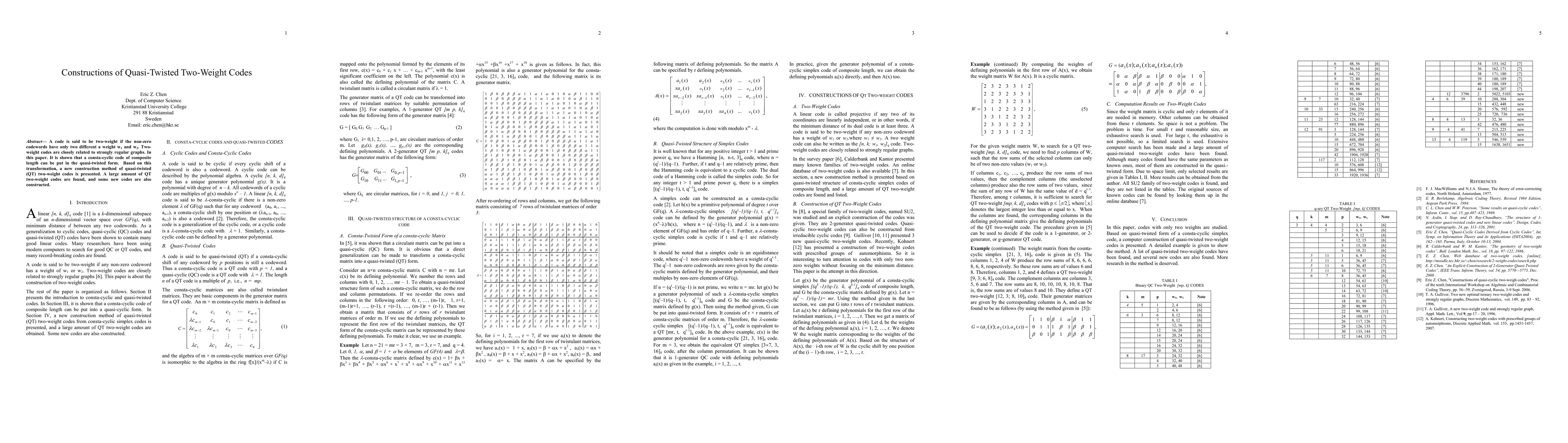 A code is said to be two-weight if the non-zero codewords have only two different a weight w1 and w2. Two-weight codes are closely related to strongly regular graphs. In this paper. It is shown that a consta-cyclic code of composite length can be put in the quasi-twisted form. Based on this transformation, a new construction method of quasi-twisted (QT) two-weight codes is presented. A large amount of QT two-weight codes are found, and some new codes are also constructed.