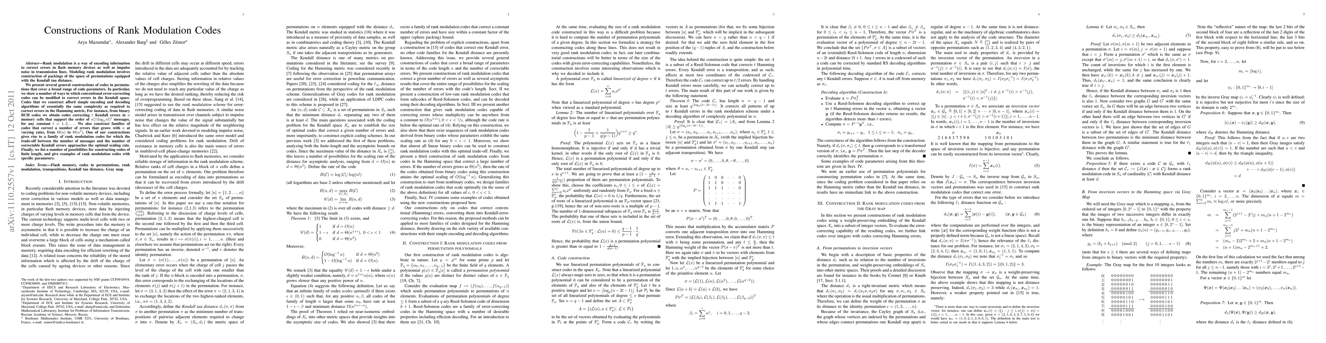 This paper presents various constructions of rank modulation codes for correcting errors in flash memory and transmission lines, using permutations and Kendall tau distance. The authors modify conventional error-correcting codes to achieve optimal trade-offs between message size and correctable errors, with encoding and decoding algorithms comparable to those in the Hamming metric.